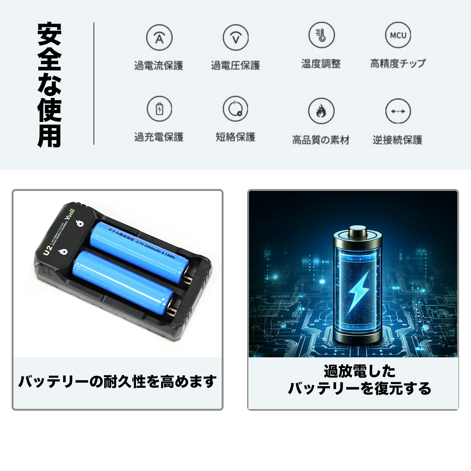 商品名 : リチウム電池充電器 USB式 2スロット バッテリー チャージ 18650用 充電器 16340/16650/17650/17670/18350/18490/18500/18650/20700/21700/26650など幅広いリチウムイオンバッテリーの充電に対応 リチウムイオン充電池用充電器 リチウム電池