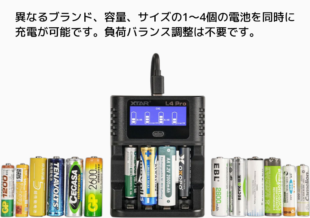 商品名 : XTAR L4 PRO リチウムイオン電池 充電器 単3 単4 エクスター 1.5V リチウムイオン 1.2V ニッケル水素 電池 バッテリー 急速 充電器 安全 小型 USB タイプC 過放電解除 リフレッシュ 機能 AA AAA 本物 正規品