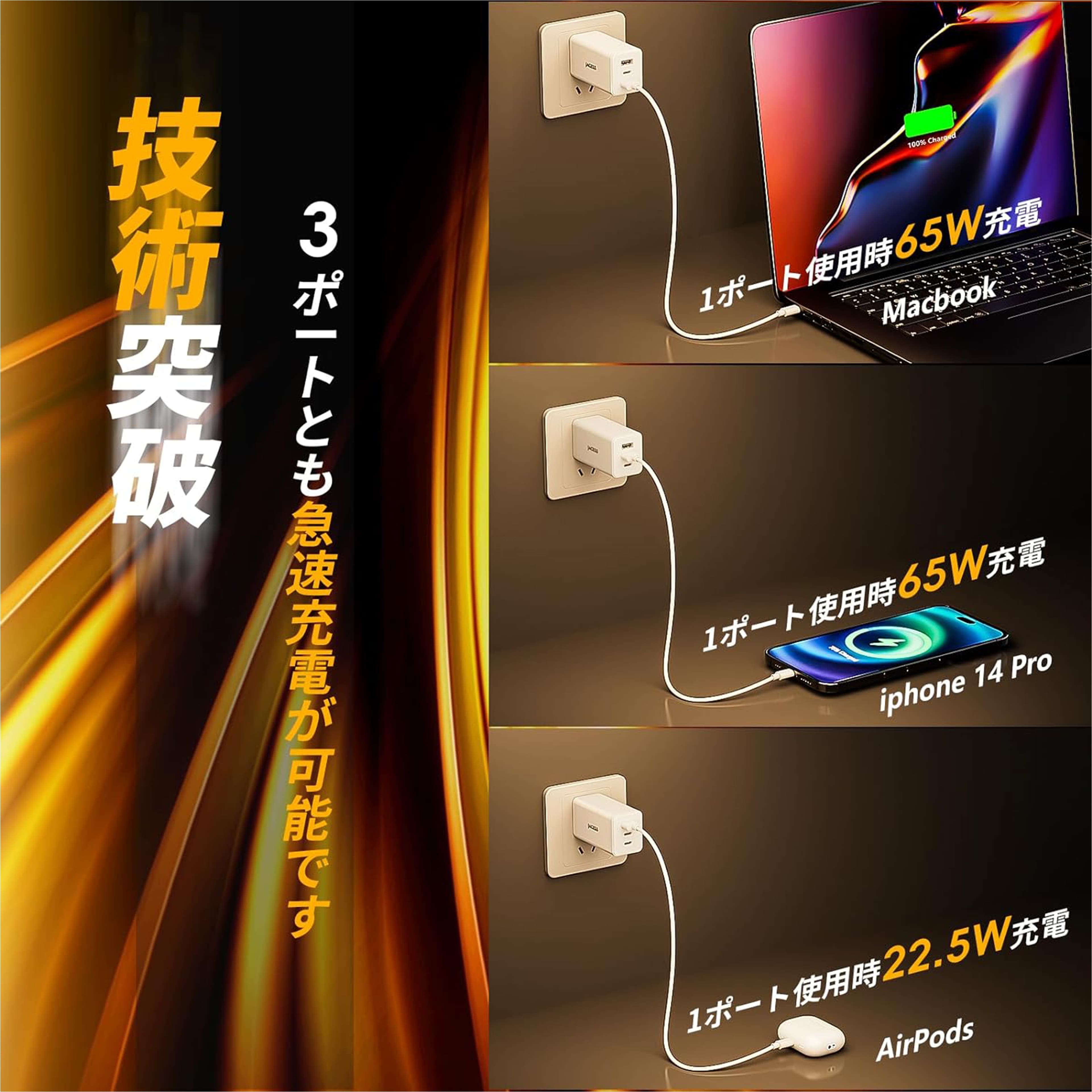商品名 : ★秒殺価格★PD 65w 業界超軽量 超小型 type-c usb 三台同時充電 急速充電器 超低温 タイプc iphone 3ポート 携帯充電器 アイフォン スマホ充電器 usb-c 折りたたみ式プラグ acアダプター MacBook/Windows PC/ノートpc/iPad/iPhone/Android機種に対応