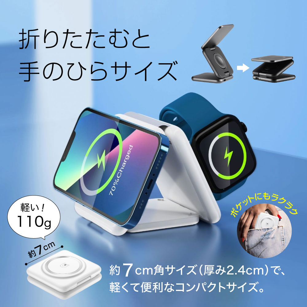 商品名 : xdoboアップルウォッチ充電器 ワイヤレス充電器 ワイヤレス充電スタンドコンパクト折りたたみ式 3in1 iphone16/12/13/14 applewatch3/4/5/6/7/8/9/ Airpods1/2/pro3 15W 充電スタンド Qi急速 携帯 Android 3sense