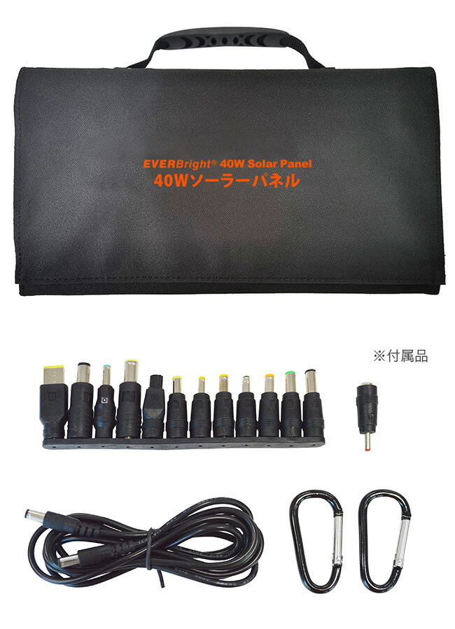 EVERBright エバーブライト 40W ソーラーパネル SSBSP-40Wの解説 スマホ等やタブレット端末、USB機器、ノートパソコンに直接充電をすることが可能なソーラーパネル。 軽量で折りたためるコンパクトサイズなので、収納にも場所をとらず持ち運びもラクラク。停電や災害などの緊急時や、キャンプや釣りなどのアウトドアでも活躍します。 別売りのスーパーメガパワーバンクと組み合わせて使えばさらに十分な充電が可能です。 EVERBright エバーブライト 40W ソーラーパネル SSBSP-40Wの詳細 商品名: EVERBright エバーブライト 40W ソーラーパネル SSBSP-40W 説明: ソーラー充電 ソーラーパネル ソーラー 蓄電器 蓄電池 太陽充電 ソーラーチャージャー ソーラーバッテリー 充電器 ソーラーバッテリー充電器 家庭用発電機 緊急時 非常時 用途・場所: ソーラー充電 太陽充電 家庭用 災害対策 災害 災害時 防災 停電 緊急時 非常時 アウトドア キャンプ 釣り 野外 スマートフォン タブレット 充電 小型家電 パソコン 使用 カテゴリー: ソーラーパネル ソーラー 蓄電器 蓄電池 充電器 ソーラー充電器 ソーラーチャージャー ソーラーバッテリー ソーラーバッテリー充電器 家庭用発電機 防災用品 形状: 折たたみ サイズ: 軽量 種類: おすすめ USB ギフト用途: ギフト プレゼント 贈り物付属品 出力ケーブル(2m)、メガパワーバンク(2400mAh)用プラグ、ノートPC用プラグアダプター(12個)、カラビナ(2個)、取扱説明書 サイズ(約) (開)1020×350×20mm(閉)350×200×40mm 重量(約) 1.4kg 生地材質 ポリエステル DC入力 (1)DC出力(最大18V/2.2A)(2)USB出力(5V/3.5A)(3)USB QC3.0出力(12V/2A、9V/2.5A、5V/3.4A、4V/3.6A) 原産国 中国 注意 ※ディスプレイの環境上、実際のカラーが再現できない場合がございます。 EVERBright商品一覧はこちらから スーパーメガパワーバンク SSBSMPB