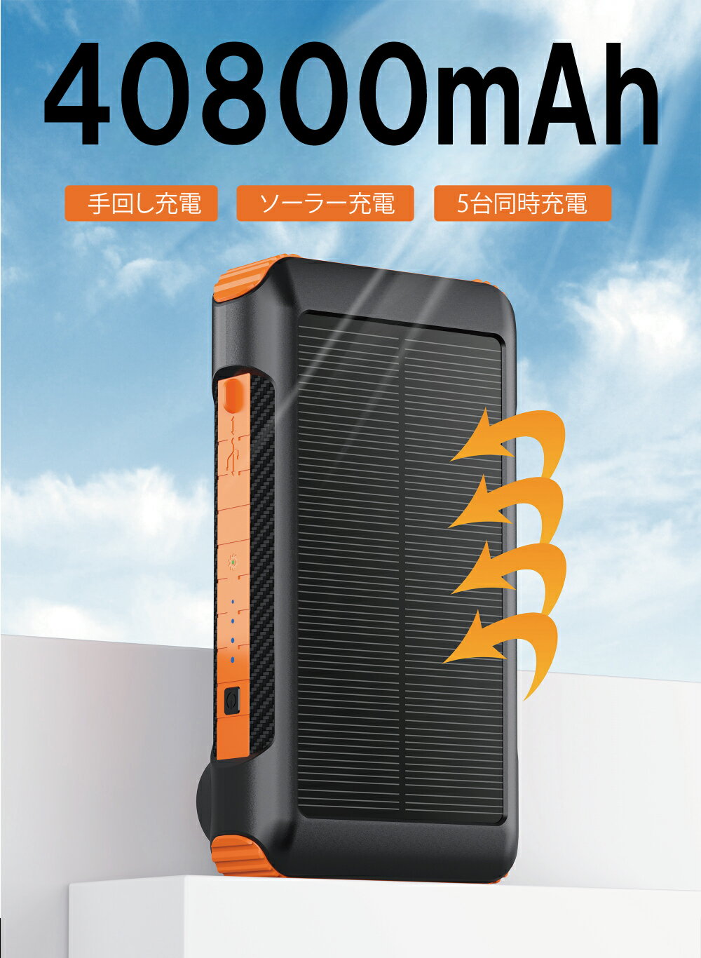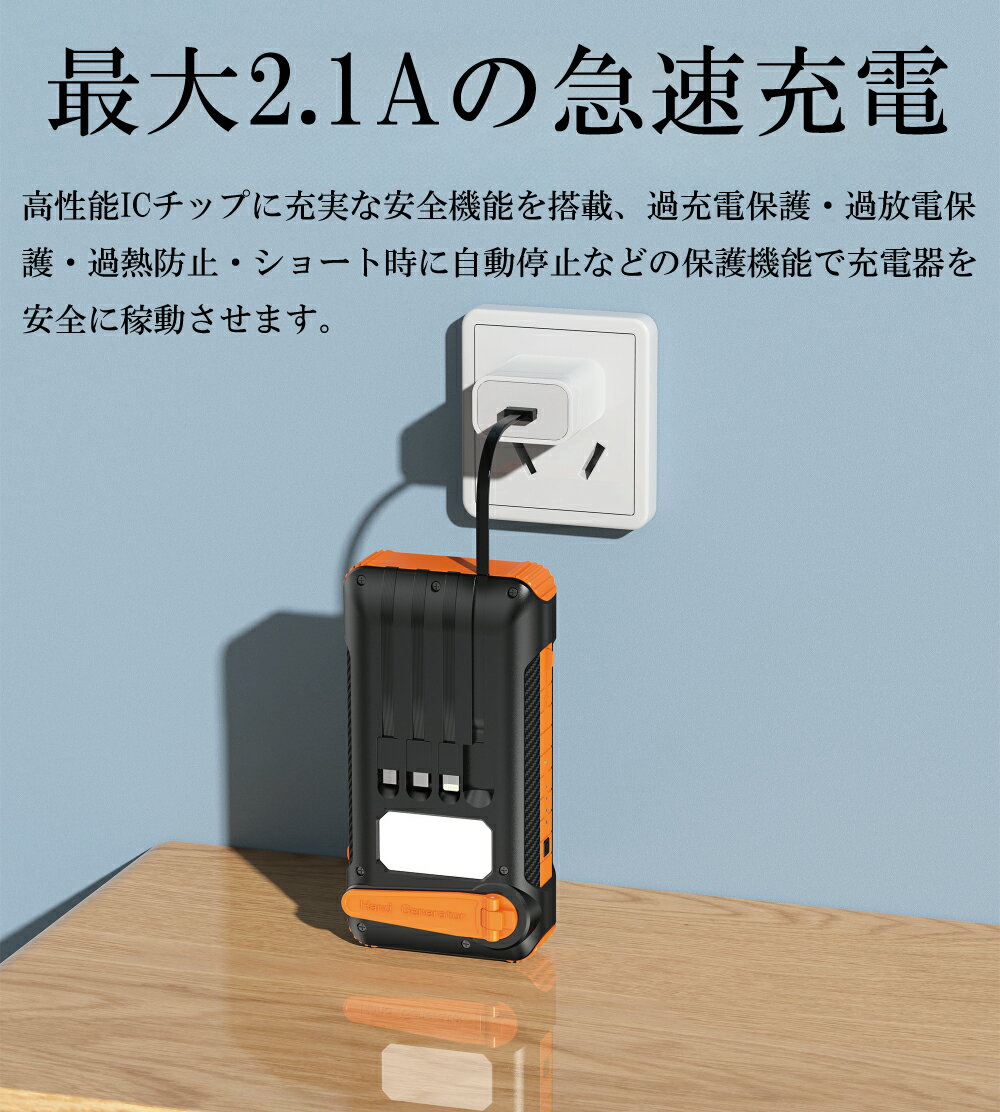 商品名 モバイルバッテリー ソーラー 大容量 【40800mAh & 手回し充電】 ソーラーモバイルバッテリー急速充電 ソーラーチャージャー 5台同時充電(4本ケーブル内蔵+USBポート)5WAY蓄電 IPX7防水 モバイルバッテリー 高輝度 LEDライト付き コンパス搭載 耐衝撃 ソーラー充電器 スマホ充電器 地震/災害/旅行 商品について 40800mah超大容量 急速充電 圧倒的な40800mAhを内蔵し、スマホやタブレット、携帯扇風機、ゲーム機などUSB充電を使った各機種に幅広く・複数回充電可能な超大容量モバイルバッテリーです。Type-C入出力ポートはiOS、Androidシステム両方と互換性のあるPD18W急速充電をサポート、充電速度は従来の2.5倍速、どのタイプのスマホもよりスピーディーな充電が実現されます。さらに、Huawei Super Charge SCP22.5Wにより、充電効率がアップして対応するデバイスを高速充電可能になりました。 ケーブル内蔵 5台同時充電可能 3規格出力ケーブル内蔵、ケーブルを持ち運ぶ必要がなく、接続したデバイスに応じた最適な電流で充電できます。さらに、2個USB出力ポート、及びType-C入出力ポートに加え、最大5台同時充電が可能なモバイルバッテリーです。スマホをモバイルバッテリーに接続し、電源ボタンを押すと充電開始、旅行、出張時に複数のスマホやデバイスの充電が必要な時でもこの一台で同時にまかなえて、停電、台風、地震など非常時の電源確保にもぴったりなUSB充電器です。 ソーラー蓄電/手回し充電/USB入力 5WAY蓄電 ソーラーパネルを搭載し、太陽光を当てることで蓄電可能なソーラーチャージャーです。アウトドアなど電源がない場所でも太陽の光さえあれば充電できます。ほかにも、内蔵USB-Aケーブル、入力用microUSBポート、Type-C入出力ポートにより、USB電源から本体への充電も可能。さらに手回し発電も可能で、ハンドルを回して発電し、スマホなどのデバイスを充電できる手回し充電器として、災害時やアウトドアシーンに重宝します。4つのLED残量ランプにより、バッテリー残量と蓄電状況が確認できます。(※ソーラー充電と手回し充電では、満タンになるまでかなり時間がかかるため、普段なら、USBから充電することをおすすめさせていただきます。) LEDライト*コンパス付き 防水/防塵/耐衝撃 LED照明ライトが2個備わり、点灯モードとフラッシュモードを切り替えられ、夜道や停電時で懐中電灯代わりに暗闇を照らし、緊急時にも役立ってくれて、簡易なコンパスにも加え、アウトドアに最適な多機能ソーラーモバイルバッテリーです。IP67防水防塵レベルがあり、耐衝撃&滑り止めABS+PC材質を採用した落下に強いゴツイ作りに加えて、過酷な環境でも蓄えた電力を守り抜き、どんな天候でも耐えられる頑丈なソーラー充電器なので、アウトドア用、防災用アイテムとして1台備えてあれば心強いです。 メーカー希望小売価格はメーカーサイトに基づいて掲載しています