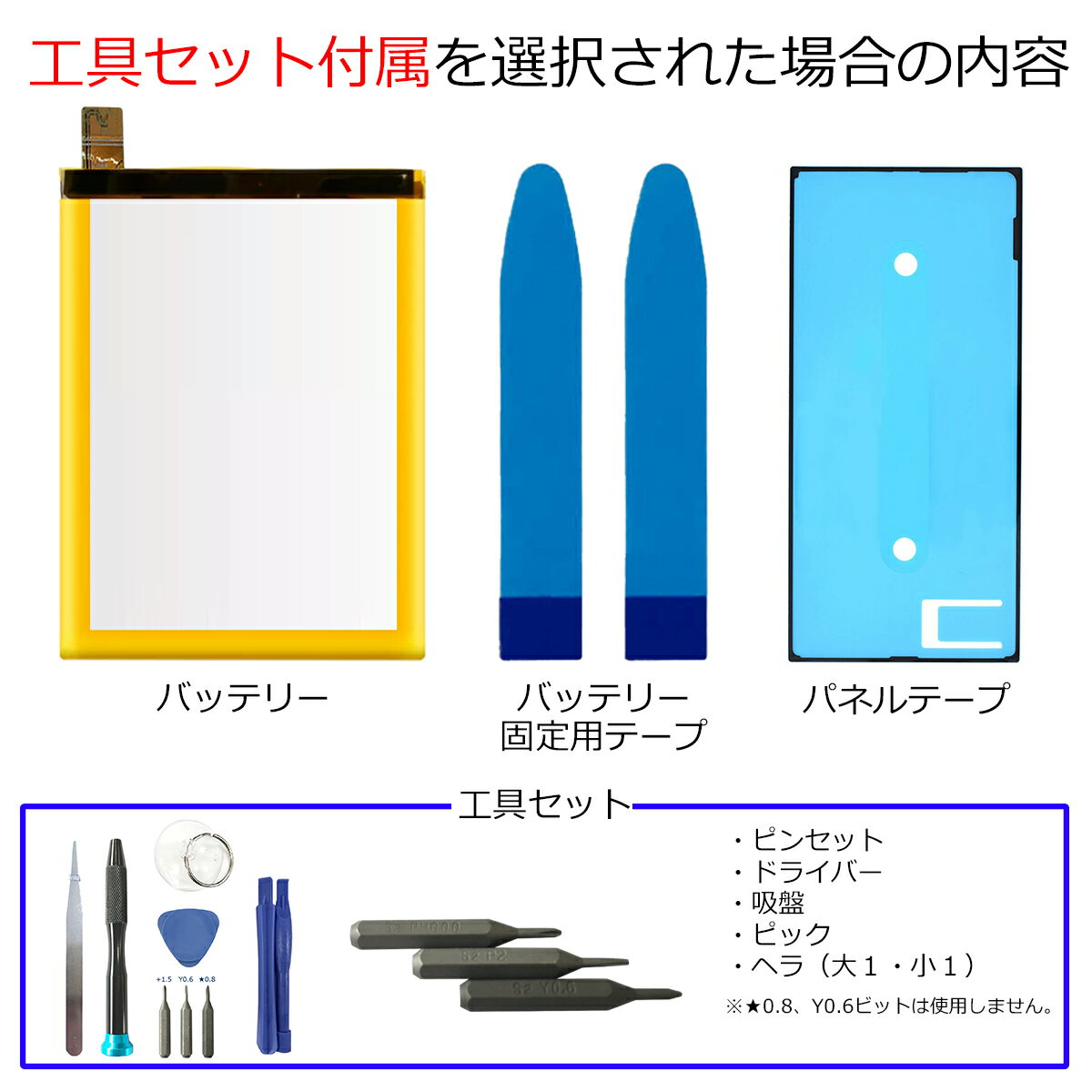 よく一緒に購入されている商品XPERIA シリーズ シーラントグルー パネ400円\楽天1位/iPhone シリーズ 大容量バッ1,950円~XPERIA シリーズ バッテリーです。 純正品と同等のコントローラーを採用。より正確な制御で安定した電源供給を行います。 ご自分で修理、交換される方向けのリペアパーツとなります。 バッテリー固定用の両面テープ・防水シールが付属します。工具セットは有無をご選択ください。 ●現在の所、Battery health Testやアプリ等による最大容量の表示には対応しておりません。(実際の値よりも低く表示されますが、記載通りの容量は実装しております) ●バッテリーの持ちが悪い、充電しなくなった時などにご使用ください。 ●本体に装着後、満充電・満放電を数回繰り返し、コンディションの調整をされる事をお勧めいたします。 ●こちらの商品を使用した際に起こった機器などの破損及び損失についての保証は一切いたしません。ご了承の上お買い上げ下さい。 ●デザインが一部写真と異なる場合がございます。 ●メールにて取付に関するサポートをお受けしております ●手順書は付属しません。交換方法につきましては「iFixit」「分解工房」「Youtube」等のサイトで事前にご確認ください。●工具セットのビットは専門のスタッフが1点1点目視で確認後、ネジ頭に当てて掛かり具合などを確認しております。不具合が無いものをお送りしておりますため、作業中になめてしまった等の破損につきまして保証はございません。 メール便の場合送料無料でお届けいたします。(保証あり・ポストに投函) あす楽に対応する配送方法は「宅急便コンパクト」のみとなります。ご注意ください。 製品保証規定 保証期間内において以下の場合を除き、不具合発生時には交換もしくは返金の対応をさせていただきます。 ・故障、不具合の原因が故意のもの、取扱い上の不注意である場合(落下・水没等) ・通常の範囲を超える状況での使用による故障・損傷・早期劣化(常に充電をしながらの使用、高温・低温下での使用など) ・充放電回数が500回前後に達した場合の劣化・長期保管後の使用時に発生した不具合 ・不具合がバッテリーに起因しない場合(作業工程に問題があるものやOSアップデートに関する動作不良など)・不具合品の返送ができない場合 XPERIA X Performance 容量:2700mAh キャリア型番:SO-04H SOV33 502SO XPERIA XZ/XZs 容量:2900mAh キャリア型番:SO-01J SO-03J SOV34 SOV35 601SO 602SO XPERIA X Compact / Z5 Compact 容量:3050mAh キャリア型番:SO-02J SO-02H ※パネルテープはX Compact用が付属します XPERIA XZ1 容量:2700mAh キャリア型番:SO-01K SOV36 701SO XPERIA XZ2 容量:3180mAh キャリア型番:SO-03K SOV37 702SO XPERIA XZ3 容量:3300mAh キャリア型番:SO-01L SOV39 801SO XPERIA XZ1 Compact/ACE 容量:2700mAh キャリア型番:SO-02K SO-02L ※パネルテープはXZ1 Compact用が付属します XPERIA XZ2 Compact 容量:2870mAh キャリア型番:SO-05K XPERIA 1 容量:3200mAh キャリア型番:SO-03L SOV40 802SO XPERIA 5 容量:3140mAh キャリア型番:SO-01M SOV41 901SO XPERIA 1 II 容量:4000mAh キャリア型番:SO-51A SOG01 XPERIA 5 II 容量:4000mAh キャリア型番:SO-52A SOG02 XPERIA 10 II 容量:3600mAh キャリア型番:SO-41A SOV43 A001SO XPERIA 1 III 容量:4500mAh キャリア型番:SO-51B SOG03 A101SO XPERIA 5 III 容量:4500mAh キャリア型番:SO-53B SOG05 A103SO XPERIA 10 III 容量:4500mAh キャリア型番:SO-52B SOG04 A102SO XPERIA 1 IV 容量:5000mAh キャリア型番:SO-51C SOG06 A201SO XPERIA 5 IV 容量:5000mAh キャリア型番:SO-54C SOG09 A204SO XPERIA 10 IV 容量:5000mAh キャリア型番:SO-52C SOG07 A202SO XPERIA 1 V 容量:5000mAh キャリア型番:SO-51D SOG10 A301SO XPERIA 5 V 容量:5000mAh キャリア型番:SO-53D SOG12 XPERIA 10 V 容量:5000mAh キャリア型番:SO-52D SOG11 A302SO XPERIA AceII AceIII 容量:4500mAh キャリア型番:SO-41B SO-53C SOG08A 203SO ※AceII AceIIIのパネルテープは汎用品が付属します ソニー エクスペリア 電池 交換 類似商品はこちらXPERIA XZ2 Compact SO-02,750円XPERIA XZ2 Compact SO-02,430円XPERIA XZ1 Compact SO-02,750円XPERIA XZ1 Compact SO-02,430円XPERIA XZ1 SO-01K SOV362,670円XPERIA XZ1 SO-01K SOV362,330円XPERIA XZ2 SO-03K SOV372,750円XPERIA XZ3 SO-01L SOV392,750円XPERIA XZ2 SO-03K SOV372,430円新着商品はこちら2026/2/10iPhone 7Plus/8Plus NFC/900円2026/1/23iPhone12 12Pro 12ProMax3,080円~2025/12/27MagSafe充電器 ワイヤレス充電器 iPh1,900円再販商品はこちら2026/2/21iPhone12mini 近接センサー+イヤー2,500円2026/2/13iPhone8/SE2 ラウドスピーカー1,500円2026/2/3iPhone5s/SE 互換 液晶パネル タッ3,500円2026/02/21 更新 \楽天1位/XPERIA シリーズ バッテリー 高品質 交換 互換 PSE準拠 1年間保証 メール便送料無料!お急ぎの方は宅急便コンパクトをお選びください ご自分で「安く」「早く」交換したい方向けのバッテリー交換キットです。減りが早くて充電ばかりしていると更に劣化を早めてしまいます。このバッテリーで新品時の快適なXPERIAを取り戻しましょう! 2
