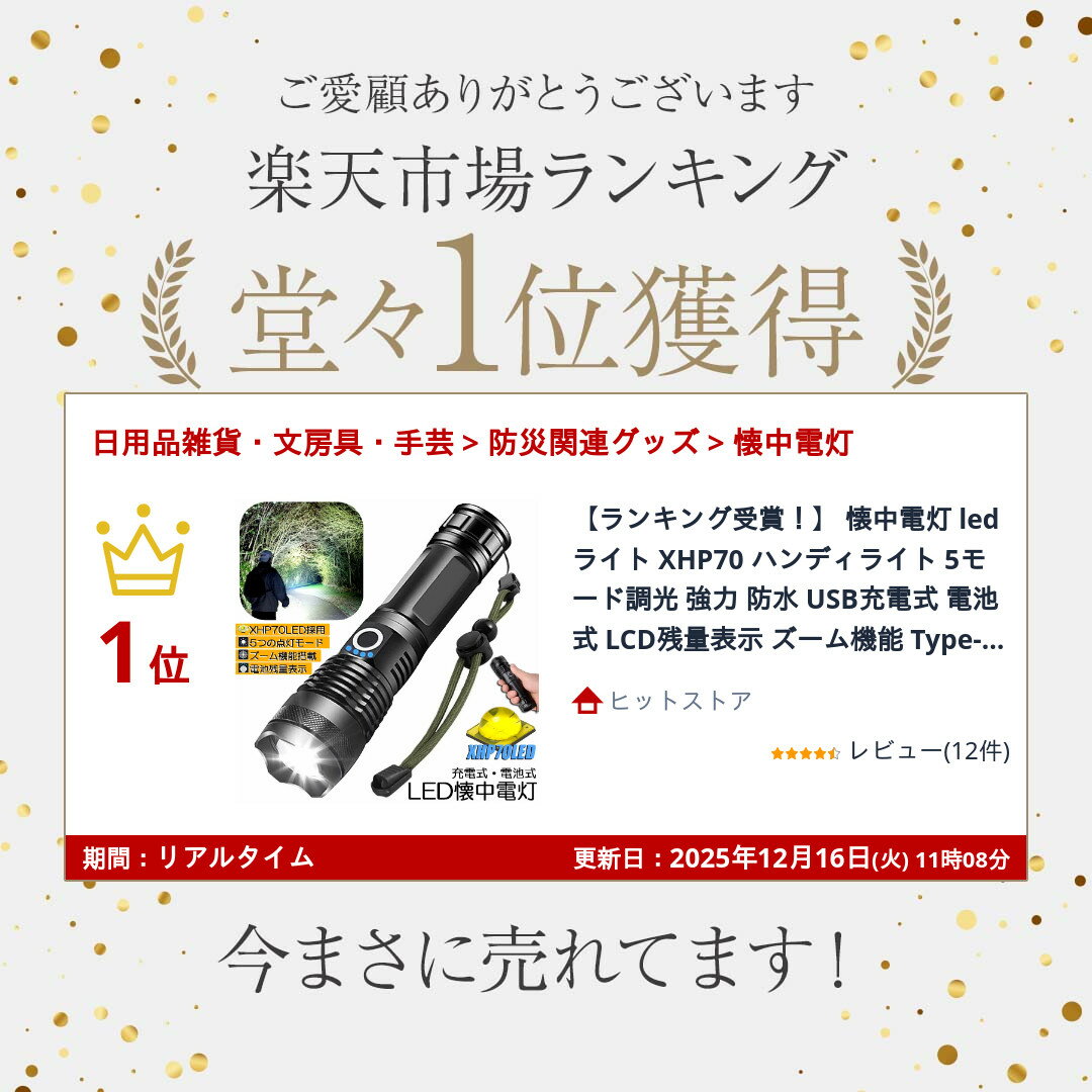 商品名 : ★スーパーセール!ポイント5倍★ 懐中電灯 ledライト XHP70 ハンディライト 5モード調光 強力 防水 USB充電式 電池式 LCD残量表示 ズーム機能 Type-C充電式 ledライト フラッシュライト led so