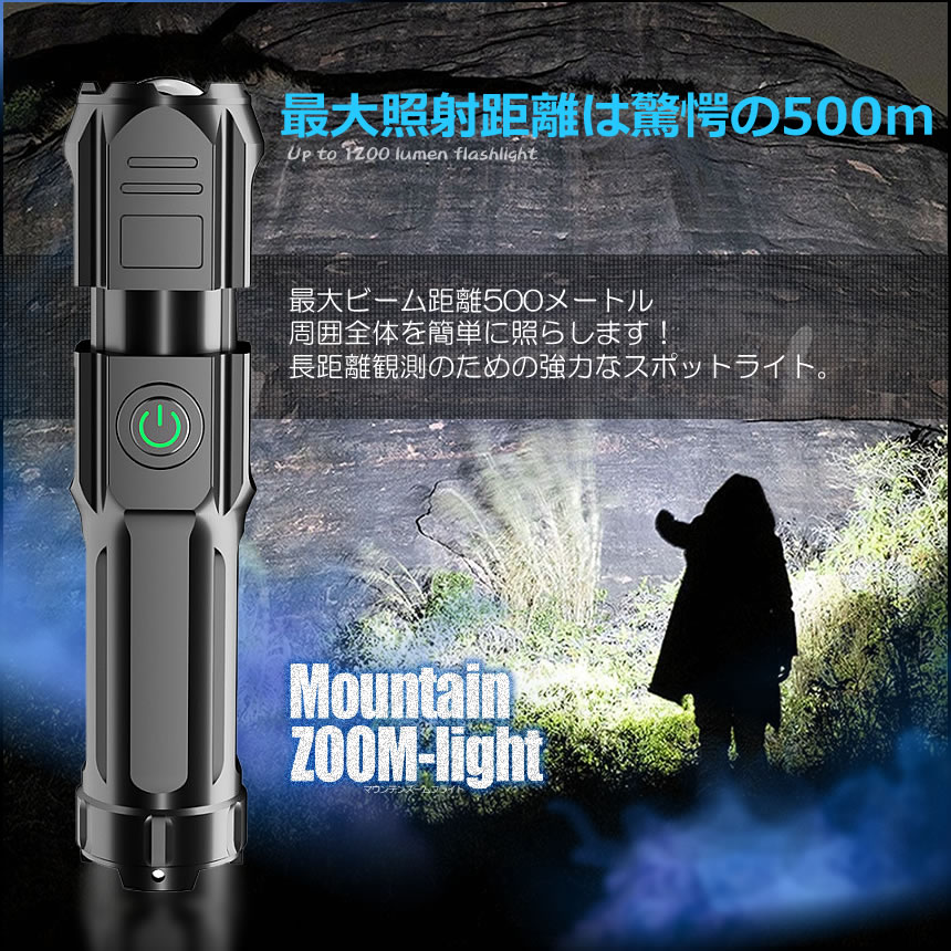 最大ビーム距離500メートル周囲全体を簡単に照らします! 長距離観測のための強力なスポットライト。3つの照明モードとズーム可能搭載高/中/ SOS、自由なズーム光を実現するズーム可能な戦術懐中電灯は広範囲の投光照明またはスポットライトを放射できます。 充電式LED懐中電灯耐久性のあるLEDチップを使用安全で信頼性が高く使いやすいキャンプ、登山、ハイキング、狩猟探索に最適な懐中電灯です。IPX5防水耐久性耐久性のあるアルミニウム合金とABSボディ傷、摩耗、腐食に耐えます。