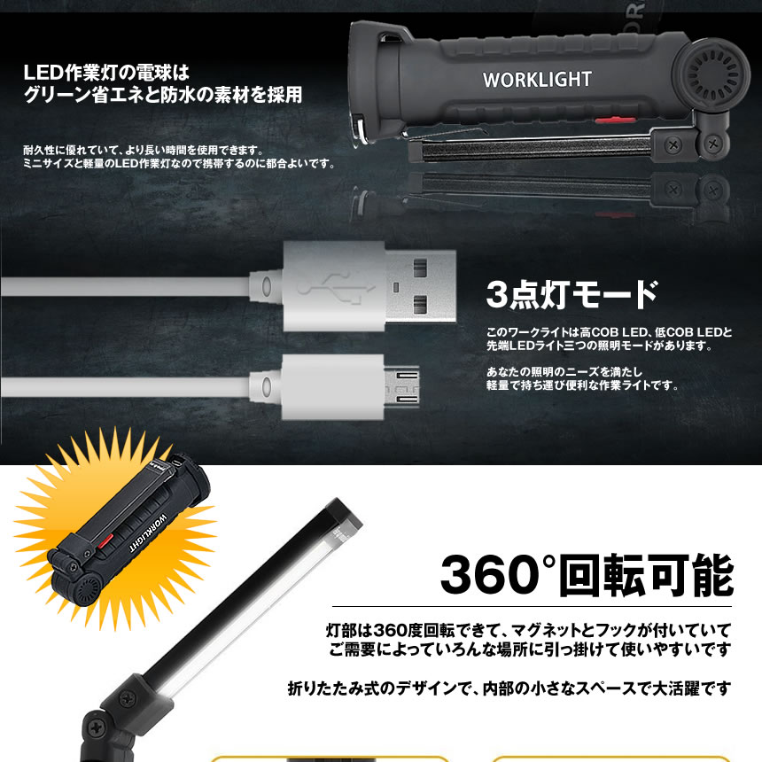 商品名 : LED 作業灯 ワーク ライト 強力 COB 明るい 携帯 夜間 作業 用 懐中電灯 マグネット付 クリップ Sサイズ DIY 整備 夜 停電 防災 USB充電式 tecc-onisagyou