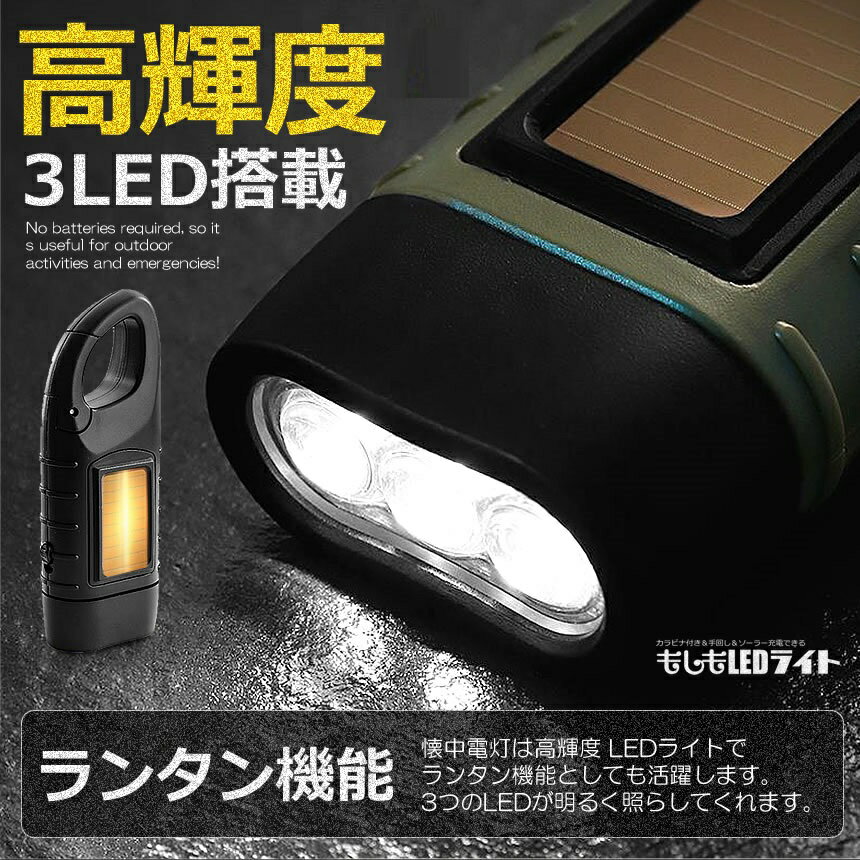 商品名 : 手回し 充電 ライト LED 懐中電灯 電池不要 ソーラー充電 小型 フック付き 停電 地震 台風 災害 避難 非常用 防災ライト キャンプ ランタン カラビナ tec-temalight02