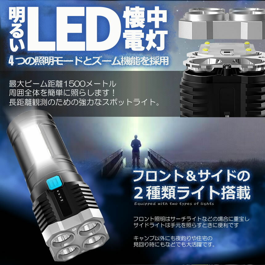 山をも照らす明るい懐中電灯♪長距離観測のための強力なスポットライト。フロント&サイドの2種類ライト搭載フロント照明はサーチライトなどの場合に重宝しサイドライトは手元を照らすときに便利ですキャンプ以外にも夜釣りや住宅の見回り時にもなどでも大活躍です。フロントライトの「強光」「弱光」「高速点滅」に加え「サイドライト点灯」でマルチに使用できます。「強光」「高速点滅」は超明るく遠くを照らすだけでなく道路での事故時などに「高速点滅」で後続車に危険を知らせる事が可能です。USB充電で度々電池を交換する必要はありません。電池残量LEDランプ搭載であとどれくらい使えるかが一目瞭然です