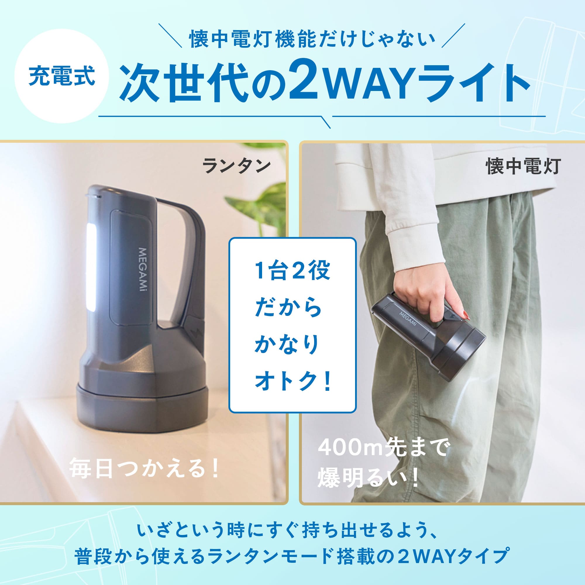 商品名 : \30%offクーポンSALE/ 2WAY 懐中電灯 & ランタン 充電式 防災ライト 生活防水 IPX4 高輝度 400m先まで照らす ledライト点灯 点滅 コンパクト 軽量 ハンディライト 明るい 耐衝撃 小型 停電 地震 登山 作業用 台風 避難 アウトドア キャンプ 夜間作業 残量表示