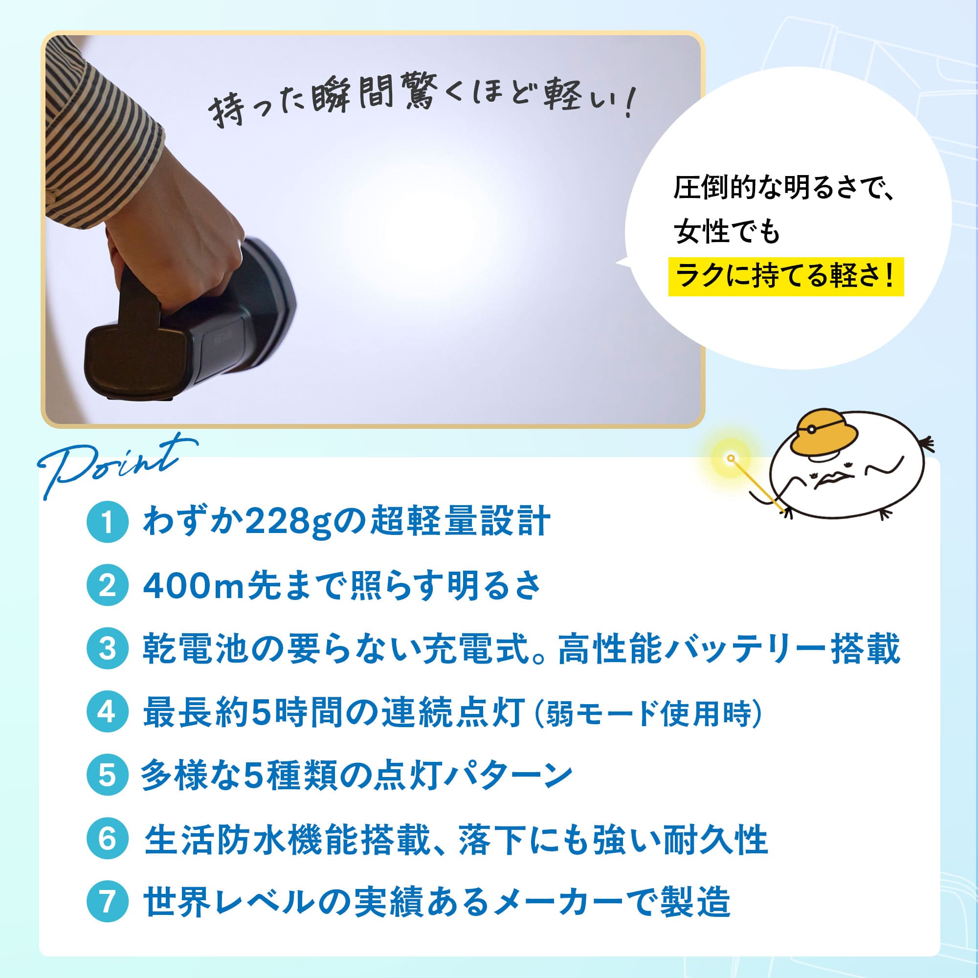 MEGAMI防災シリーズ 累計1億回分の非常用トイレ「トイレの女神PREMIUM」を販売している日本の商社が企画 防災と日々の暮らしを知り尽くしたプロが考えました。 1台2役 懐中電灯&ランタン 避難時は懐中電灯、避難先ではランタン。防災リュックには2台も入り切らない。圧倒的な軽さと、ペットボトルサイズのコンパクトさ。 圧倒的な高性能懐中電灯 400m先まで届く。最大5時間使用可能で安心の生活防水 IPX4。 充電式高性能バッテリー 3000mAhの大容量。USB Type-Cで充電可能。モバイルバッテリーや車載USBでも充電できます。 5種類の点灯パターン 通常モード:強、弱、側面ランタンモード。 災害時:SOS救難信号、フラッシュ点滅モード 災害時だけでなく普段から使える 読書時のあかりとして。ベッドライトとして。夜釣り、車中泊、アウトドアにも。 1年保証付 グローバル品質の製品をもっと安心して使えるよう、1年のメーカー保証を付けました。 商品名 MEGAMI 懐中電灯 & ランタン 充電式ライト 防災ライト 生活防水 IPX4 高輝度 400m先まで照らす ledライト点灯 点滅 コンパクト 軽量 ハンディライト 明るい 耐衝撃 小型 停電 地震 登山 作業用 台風 避難 アウトドア キャンプ 夜間作業 残量表示 ライトの女神 商品サイズ 横9.9cm x 奥行き16.8 cm x 高さ9.3cm228g 仕様 輝度:主灯450ルーメン / 側灯200ルーメンライト出力:5W点灯時間:5時間(弱モード)充電時間:3.5時間 関連カテゴリ: 備蓄用 トイレットペーパー 備蓄 簡易トイレ 防災トイレ おすすめ 人気 非常用トイレ 災害トイレ 非常用 災害 トイレ キャンプ 凝固剤 防災用トイレ 避難所トイレ 防災 備蓄 セット 大便 便座 小便 大便 排便 女性 介護用トイレ 自宅 避難所 車内 ドライブ 非常持ち出し 非常用簡易トイレ