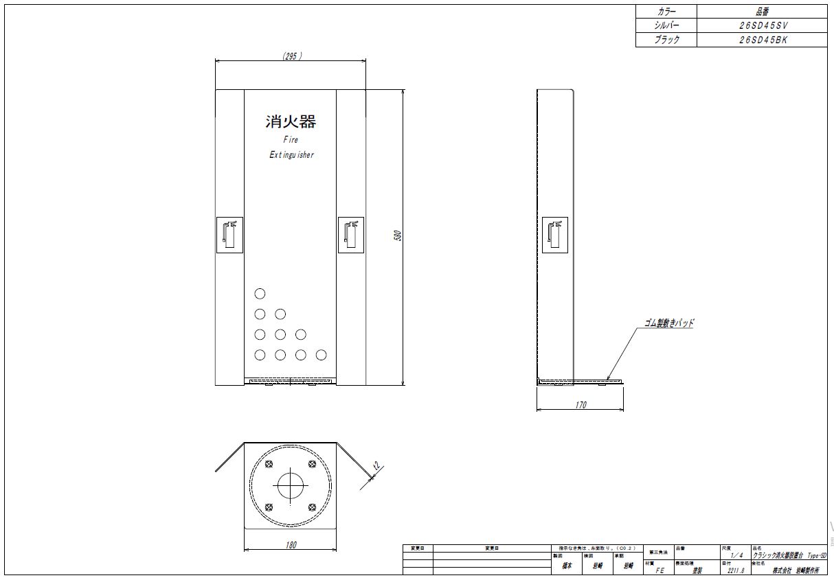 傷や破損がみられる場合は、お受け取りの際に配送業者が立ち会った状況で、 現物確認の上報告が必要です。 お手数ではございますが、お受け取りの際には【かならず】 ドライバーがいる状態での商品の現物確認をお願い申し上げます。 【メーカー直送品■2~4営業日出荷予定】 高級志向の消火器設置台です。左右からも消火器を示すピクトグラムが表示されながらも消火器が隠れるデザインです。ショールームやショッピング店舗など室内のイメージを損なわないデザインです。上品な風合いとシックなカラーで、室内のイメージを損なわず、消火器の存在を示せる設置台です。店舗やホテル・展示会場などに最適です。 組み立ていらずで設置が簡単! 厚みのあるプレートを使用しているので安定性抜群です。 設置場所を選ばないシンプルかつ高級感あるれるデザイン 側面がオープンなので消火器の取り出しが簡単! シースルーデザインで消火器の有無を確認できます。 敷パット付きで錆びやすい消火器の底面を保護です。 ピクトグラムと英文表記で多国籍に対応です。 底面ゴム付きで床面の傷付け防止や滑り止めに対応です。【サイズ】580×295×170【カラー】ブラック材質鉄製/粉体塗装高さ(mm)580幅(mm)295底面幅(mm)180奥行(mm)170設置範囲(Φ)170