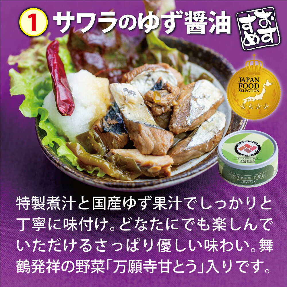 〜繊細で上品な白身魚〜海の白妙(しろたえ)セット 内容量 3缶セット…サワラのゆず醤油×1缶、スズキのアヒージョ×1缶、カマスのアヒージョカレー×1缶 4缶セット…サワラのゆず醤油×2缶、スズキのアヒージョ×1缶、カマスのアヒージョカレー×1缶 6缶セット…サワラのゆず醤油×2缶、スズキのアヒージョ×1缶、スズキのアヒージョカレー×1缶、カマスのアヒージョ×1缶、カマスのアヒージョカレー×1缶 9缶セット…【サワラ・スズキ・カマス】全種のゆず醤油×各1缶、全種のアヒージョ×各1缶、全種のアヒージョカレー×各1缶 サワラのゆず醤油(万願寺甘とい入り)の単品購入はこちらから サワラのアヒージョの単品購入はこちらから ゆず醤油、ただ美味しい海鮮缶詰を求めて辿り着いた結論です 爽やかなゆず醤油で丁寧に味付けされた海鮮に、万願寺とうがらしをアクセントとして加えた、新鮮な海の恵みと野菜の甘みが香るプレミアムなひと缶です。 ゆず醤油の独特の辛味と上品な甘みが海鮮の旨味を一層引き立て、奥深い味わいを生み出すことに成功しました。 ゆずの優雅な風味が織りなす贅沢なひと時をぜひ、大切なあの人への贈り物に。 日々の食卓やお酒のおつまみにも最適な、至高の海鮮缶詰です。 海鮮アヒージョ、オリーブオイルにとことんこだわりました 言うまでもなくオリーブオイルはアヒージョの命。いくら具材が優秀でもオリーブオイルが低品質では美味しいアヒージョはできません。 CAN BRICKの海鮮アヒージョに使用しているオリーブオイルは、地中海沿岸地域で収穫されたオリーブをイタリアで製品化した、厳選・高級エキストラバージンオイルです。 地中海沿岸地域で採れたオリーブを使う理由 地中海沿岸は温暖で日照量が多く、オリーブ栽培に適した気候です。また、適度な湿度と栄養豊富な土壌により、風味や品質が高いオリーブが育ちます。 また地中海沿岸地域では何千年ものオリーブ栽培の歴史があり、収穫や加工に関する高度な技術が伝統的に受け継がれています。 このため、品質の高いオリーブが安定して生産されています。 イタリアでオリーブオイルに製品化する理由 イタリアはオリーブオイル生産で世界的な評価を得ており、厳格な品質管理基準があります。 イタリアで製品化されたオリーブオイルは圧倒的高品質で、世界中で高く評価されています。 またイタリアの製造業者は、エキストラバージンオリーブオイルの抽出において、酸化を防ぐために最新の設備と技術を使い、低温での圧搾(コールドプレス)を徹底しています。 これにより、オリーブの風味や栄養が最大限に引き出されます。 CAN BRICKの缶詰ギフトが喜ばれる理由 当店の缶詰に使用している魚は全て、海の京都・舞鶴市で取れたものです。取れたて新鮮な魚の旨味をそのまま保存性の高い缶詰にすることで、全国どこでも・いつでも、取れたての魚の芳醇な味わいを楽しむことができるのです。 一般的に流通している大量生産の缶詰には、pH調整剤や酸化防止剤、増粘剤・安定剤や発色剤などの添加物が使用される場合がありますが、当店の缶詰にはそれらの添加物は自社工場生産において一切入れておりません。 無添加へのこだわりが、1,095日という賞味期限を実現しました。 なので胸を張って言えます。「安心・安全」と。 【贈答品として】あなたの大切なあの人へ、自信を持ってお贈りください。 入学・結婚記念・誕生日・出産・引き出物・来場御礼・お中元・お歳暮・お年賀・父の日・母の日・敬老の日etc...どのような慶事にも必ずお喜びいただけるCAN BRICKの缶詰ギフトです。 【ご家庭用・個人用として】自分へのご褒美に。ご家族との食卓に。海の京都・舞鶴の海鮮をお楽しみください。「贈り物に利用したいけど、これ本当に美味しいの?」 そんなあなたのために「6種類から3缶選べるお試しセット」をご用意しました! 3,600円相当の品が30%OFFの2,560円(税込・送料無料)でお試しいただける非常にお得な商品です!ぜひご利用ください! 「6種類から3缶選べるお試しセット」ページに行く 注意事項:モニターの発色により、実物と異なる場合がございます。