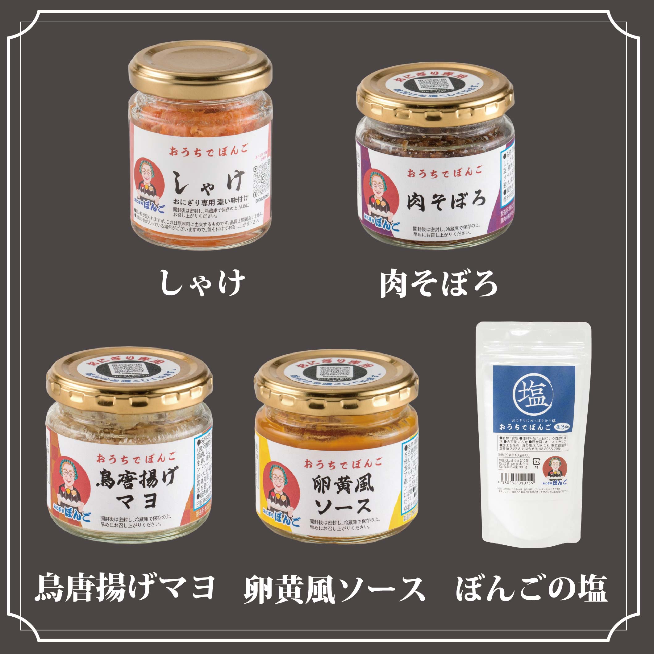 商品名 : おうちでぼんごおためしセット(ぼんごのおにぎり満喫セット)おうちでぼんごの人気商品詰め合わせ ギフト ごはんのお供 大塚 おにぎりぼんご ラジオでご飯のお供グランプリ受賞