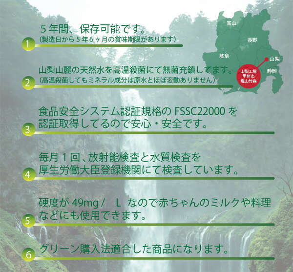 山梨県甲州の5年保存水は、災害の備え、通常の飲料や様々な用途で活躍してくれます。 ・5年保存が可能(公的機関で試験検査を合格しています。) ・山梨山麓の天然水を高温殺菌にて無菌充填しています。(高温殺菌してもミネラル成分は原水とほど変動ありません。 ・食品安全システム認証規格のFSSC22000を認証取得しているので安心・安全です。 ・毎月1回、放射能検査と水質検査を厚生労働大臣登録機関にて検査しています。 硬度が49mg/Lなので赤ちゃんのミルクや料理などにも使用できます。 グリーン購入法に適合した商品です。 【商品名】山梨県甲州の5年保存水ミネラルウォーター ペットボトル(PET) 【内容量】2リットル×6本 【原材料名】水(深井戸水) 【採水地】山梨県 【主成分等】カルシウム14mg、マグネシウム3mg、カリウム2mg、ナトリウム8mg、硬度49(1L当たり) 【賞味期限】製造日より5年6ヶ月 【配送方法】 ・発送ラベルを直接商品の外装パッケージに貼った状態でのお届けになります。 ・2ケースを結束バンドまたはPPテープで連結し発送致します。 【注意事項】 ・商品は材質上、運送時に角が多少潰れたりする可能性がありますが、返品及び交換の対応はできません。 ・商品パッケージは予告無く変更される場合がありますので、登録画像と異なることがございます。