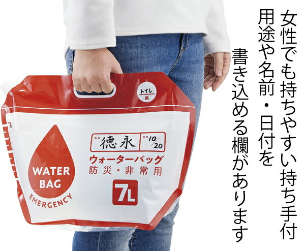 災害時に便利な折りたたみウォーターバッグ。コンパクトでどこでも入れられるので非常時出袋のポケットにも。女性にも持ち運びやすい持ち手付。断水などの非常時に便利。災害時だけでなくアウトドアにも。そそぐのに便利なキャップ付。トイレ用にはレッド、飲み水にはブルーなど、使用目的によって色分けするのがオススメ。 ■素材/本体:ポリエチレン、ポリアミド、ポリエチレンテレフタレート キャップ・ノズル:ポリエチレン ■サイズ/5L:38×29×3cm(マチ13.5cm) 7L:42×32×3cm(マチ16cm) ■セット内容/5L・7L各1個
