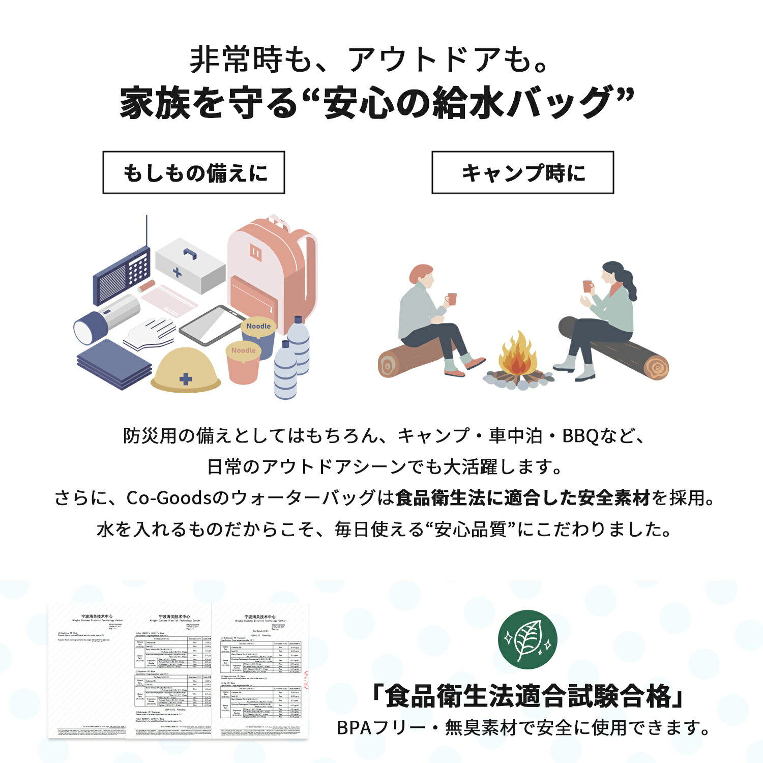 商品名 折りたためるウォータータンク ブランド名 Co-Goods( コーグッズ ) 商品説明 🟦【Co-Goods セーフティシリーズ】 「いざという時の“水”を、もっと安心・便利に。」 停電・断水などの非常時、最も困るのは“水の確保”。 そんな現場の声をもとに誕生したのが、 **折りたためるウォータータンク(5L/10L)**です。 透明で中身が見えるメモリ付きデザイン。 軽量で持ちやすく、使わないときは小さくたたんで収納可能。 防災にもアウトドアにも頼れる1枚です。 ● 透明メモリ付きで残量がひと目でわかる 側面の目盛りで水量を簡単にチェック。 「あとどれくらい残っている?」がすぐにわかるから、 料理や衛生用の水管理にも便利です。 ● 両手が使える蛇口付き 片手で押さえなくても注げる回転コック式蛇口を採用。 ひねるだけで水が出て、手を離すと止まる設計。 コップに注ぐ・手を洗うなどのシーンでも快適&衛生的です。 ● 安心の食品衛生法適合素材 口に入れる“水”を扱うものだからこそ、安全にもこだわりました。 食品衛生法(厚生労働省告示第370号)適合素材を使用。 BPAフリーで、有害物質やにおい移りの心配もありません。 飲料水・調理用の給水にも安心です。 ● 地面でも安定、丈夫な三層構造 PET・ナイロン・PEの三層構造で、 砂利の上や屋外でも破れにくく、耐久性抜群。 底は三角マチ構造で安定しやすく、倒れにくい設計です。 ● 手にフィットする一体型ハンドル 持ちやすさを追求した一体型ハンドルを採用。 重い水を入れても手が痛くなりにくく、 屋外での持ち運びもラクラク。 ● 使わない時はたたんでコンパクトに 使い終わったら3ステップで折りたたんで収納。 防災リュックや車のトランクにもすっきり収まります。 いざという時、すぐに取り出せる安心設計です。 ● 防災にも、キャンプにも活躍 断水時の備蓄水はもちろん、キャンプ・車中泊・BBQ・スポーツ観戦にも。 家族や仲間とのアウトドアシーンにもぴったり。 「防災×日常」で長く使える給水バッグです。 ● 選べる2サイズ・お得なセットも 5Lタイプ:持ち運びしやすく日常備えに最適。 10Lタイプ:ファミリーキャンプや非常時の給水におすすめ。 さらにお得な3枚セット(5L×3/10L×3/5L+10L組合せ)もご用意。 容量 5L 10L 材質 材質:PET・PA・PE(3層構造)蛇口:PP 関連キーワード ウォータータンク ウォーターバッグ 水タンク 給水タンク ポリタンク 折りたたみ キャンプ 防災グッズ 非常用ウォーターバッグ 給水袋 防災 災害用 折りたたみ給水タンク 携帯型タンク BPAフリー 食品衛生法適合 蛇口付きウォーターバッグ 非常用給水袋 コンパクト収納 軽量 防災リュック用 車中泊 アウトドア 備蓄水 断水対策【日本規格検査済】ウォータータンク 折りたたみ 【便利な蛇口付き】 メモリ付き ウォータータンク 5L 10L ウォーターバッグ 給水袋 レバー式 キャンプ アウトドア 防災 非常用 避難用グッズ 備蓄 携帯 透明 自立 コンパクト 口を付けずに膨らませる 腰クッション 選べる内容量!非常用トイレ 【きゅうりとほぼ一緒!】超軽量×直径99cmのビッグサイズ◎折りたたみ傘 【驚異の5WAY★】リュックにもなるボストンバッグ 30L/50L