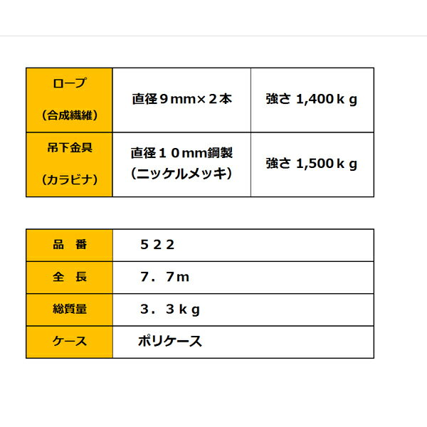 はしご型避難ロープ ステップダンII型【522】 2、3F用 ■未検定■ カラビナ式 全長7.7m 重量3.3kg 降下中の回転を防ぎ、確実に手足を掛けることが出来て、安全に避難することが出来る。 ●特 長 ・収納がコンパクト ・軽くて扱い易い ・取付けが簡単 ・強度1トンに耐える ・長期間変質しない ●仕 様 ・ロープ(合成繊維) 直径9mm×2、強さ1400kg ・つり下げ金具(カラビナ変D型)(ニッケルメッキ) 直径10mm鋼材、強さ1500kgはしご型避難ロープ ステップダンII型【522】 2、3F用 ■未検定■ カラビナ式 全長7.7m 重量3.3kg 降下中の回転を防ぎ、確実に手足を掛けることが出来て、安全に避難することが出来る。 ●特 長 ・収納がコンパクト ・軽くて扱い易い ・取付けが簡単 ・強度1トンに耐える ・長期間変質しない ●仕 様 ・ロープ(合成繊維) 直径9mm×2、強さ1400kg ・つり下げ金具(カラビナ変D型)(ニッケルメッキ) 直径10mm鋼材、強さ1500kg 早見表 検定品 【5013】 2階用 カラビナ部以下性能評定品 未検品 【522】 2階、3階用 ※消防法設置対象に使用不可 カラビナ式 オプション可変フック付(ビニール袋)