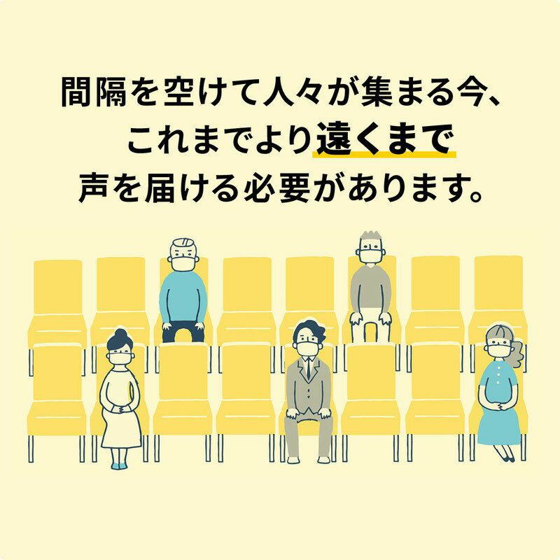 会議/イベント/などで活用できる高出力200Wのワイヤレスマイク・スピーカー。広い会議室や体育館などでも使え、移動に便利なキャスターを備えたワイヤレスマイク付き拡声器スピーカー。PAシステム。<特長>【スピーカー部】●最大200Wの大出力で広い会議室や体育館などでも使え広範囲に拡声ができる大型の拡声器スピーカーです。●屋内環境で約2,300〜2,500平方メートル程度での使用に最適です。●ワイヤレスマイク2本、有線マイク1本の入力に対応しており自由に移動しながらの同時使用が可能です。●ワイヤレスマイクは充電式ニッケル水素電池に対応しておりスピーカー背面のマイクホルダー部にセットすることで充電できます。●市販のダイナミックマイク(有線)も接続できる標準的なマイク入力端子(φ6.3mm標準ジャック)を1系統搭載しています。※パソコン用のコンデンサーマイクは使用できません。●USBメモリ内のMP3データの再生が可能なオーディオプレーヤーを内蔵し、マイクとの同時利用も可能です。●AC電源駆動と内蔵バッテリー駆動の2WAY動作が可能で、電源供給のない場所での使用もでき様々な場所で使用できます。●バッテリーは満充電から通常使用で最大4時間(音量50%程度)の利用が可能です。●マイクミキシング機能を搭載しており、外部入力からの音楽などをスピーカーから出力することができます。●ミキシング機能でカラオケスピーカーとして利用したり、結婚式の2次会やパーティーなどにバックミュージックと共にアナウンスを流したりできます。●外部音声出力(LINE OUT)も搭載しており、外部機器への録音や、本製品複数台をカスケード接続することで複数台のスピーカーから同時に拡声出力することも可能です。●スピーカースタンド設置に対応しています。(35mmマウントホール)また、三脚を取り付けてスタンド付スピーカーとして使用することもできます。●本体収納カバーが付属しており保管時の汚れ防止にも最適で付属品のワイヤレスマイクや電源ケーブルなどを一緒に収納することが可能です。●移動に便利な大型キャスターと伸縮ハンドルを備え移動が楽に行えます。【ワイヤレスマイク部】●特定小電力無線局ラジオマイク(800MHz帯)規格に適合したワイヤレスマイクです。●B型帯域を使用しており30波の中から1波を選択して利用できます。●充電式ニッケル水素電池に対応しておりスピーカー(400-SP093)背面のマイクホルダー部にセットすることで充電することができます。<仕様>【スピーカー】■サイズ:約W300×D300×H568mm(突起物除く)■重量:約12.8kg■実用最大出力:200W(135W+65W)■周波数特性:65Hz〜20KHz■スピーカー形式:バスレフ型フルレンジスピーカー(防磁設計)■スピーカーサイズ:10インチ(直径254mm)■ツィーターサイズ:1.0インチ(直径約25.4mm)■ロードインピーダンス:ウーファーユニット/4Ω、ツィーターユニット/8Ω■対応ワイヤレスマイク:2本■外部入力:φ6.3mm標準ジャック(マイク・楽器用)×1、3.5mmステレオミニジャック(外部音声入力用)×1、RCA(赤白)ピンジャック(外部音声入力用)×1■外部出力:φ6.3mm標準ジャック(外部音声出力用)×1■電源:AC100V50/60Hz、内蔵リチウムイオン電池(25.9V/2200mAh)■充電方法:AC電源(100V)■充電時間:約2時間■連続使用時間:マイク使用で約10〜12時間程度音楽再生時で約5〜6時間程度(バッテリー駆動時、中間音量)■セット内容:スピーカー本体×1、ワイヤレスマイク×2、収納用カバー、電源ケーブル×1■生産国:中国■保証期間:購入日より6ヶ月■取扱説明書:日本語取扱説明書あり【ワイヤレスマイク】■サイズ:口径36×H240mm■重量:約190g■型式:単一指向性ダイナミックマイク■アンテナ形式:内蔵アンテナ■周波数特性:806.125〜809.750MHz■発振方式:水晶制御PLLシンセサイザー■電波形式:F3E■トーン信号:35kHz■空中線電力:10mW■送信周波数安定度:20ppm以下■不要輻射:2.5μW以下■基準周波数偏移:±30kHz■最大周波数偏移:±35kHz■電源電圧:DC3V(単3形乾電池×2)■電池寿命:約6.5時間(アルカリ電池使用時)■感度:-76±3dB■インピーダンス:220Ω■生産国:中国■保証期間:購入日より6ヶ月■取扱説明書:日本語取扱説明書あり※ワイヤレスマイクは、エネループなどの充電式ニッケル水素電池の使用が必要です。充電池はエネループなどの充電式ニッケル水素電池のみの対応です。全てのニッケル水素電池・またはその他仕様の充電池の動作保証をするものではありません。また、アルカリ乾電池をご使用の場合は充電は出来ません。※充電式ニッケル水素電池を使用する場合は2000mA以上を推奨しています。2000mAh以下だと充電できない場合があります。※スピーカースタンドは耐荷重13kg以上のスピーカースタンドをご使用ください。<関連キーワード>400-SP093 サンワサプライ マイク スピーカーセット,PAシステム,拡声器,ラインナップ