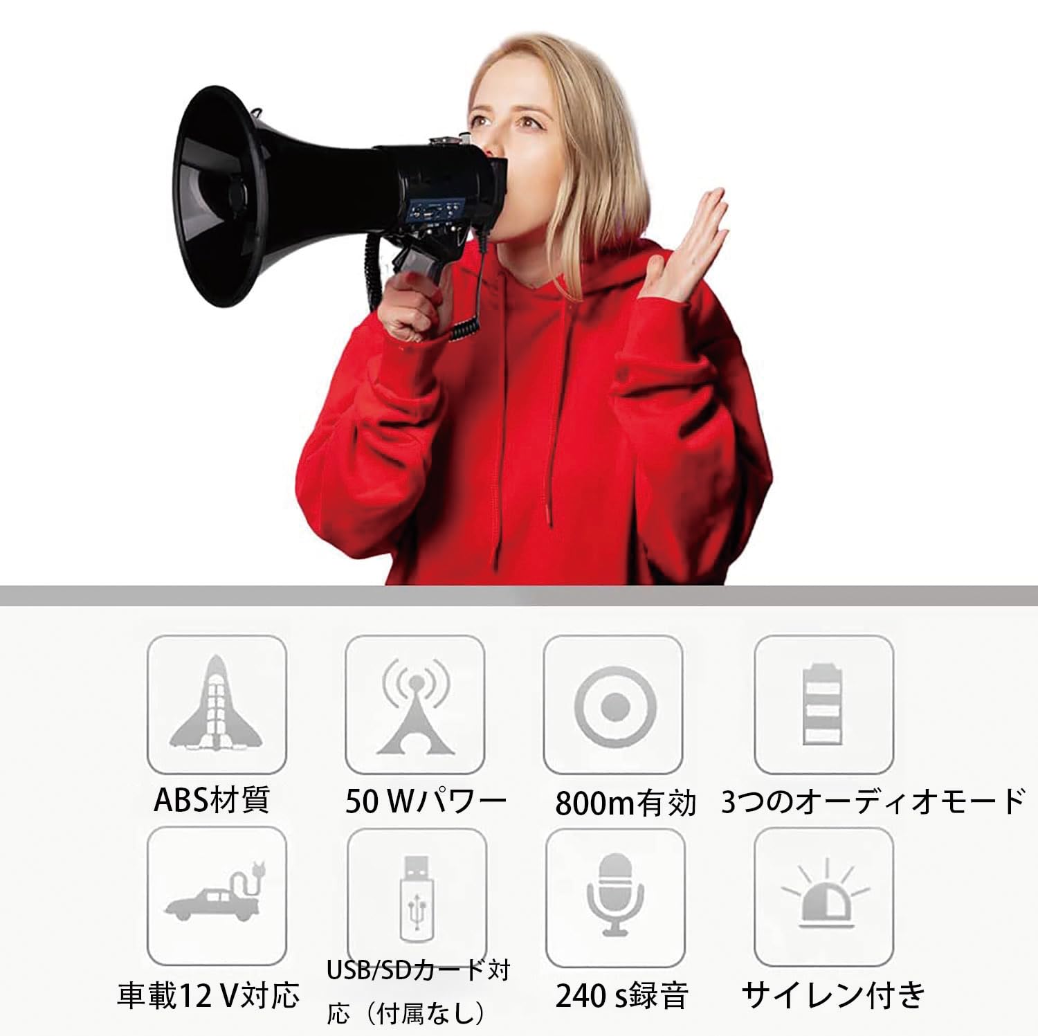 商品名 : ハンディメガホン 拡声器 高出力50W メガホン 大音量 充電式 高硬度ラウドスピーカー 3.5mm AUX入力 軽量 ハンドヘルドスピーカー イベント 800ヤードレンジ音声 スピーカー屋外用 運動会 避難訓練 演説 消防