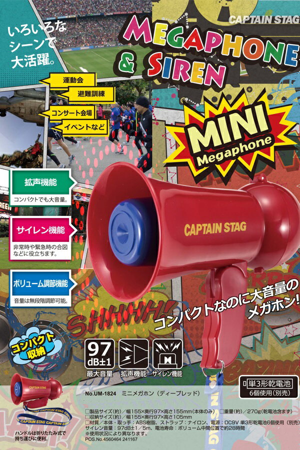 【コンパクトなのに大音量のメガホン】 ・拡声、サイレント、ボリューム調節機能付。 ・単3形乾電池6個使用(別売) メーカー品番 UM-1824 商品詳細 ●サイズ(約):幅155×奥行97×高さ155mm(本体のみ) ●収納サイズ(約):幅155×97×105mm ●重量:270g(乾電池含まず) ●材質:本体・取っ手/ABS樹脂、ストラップ/ナイロン ●電源:DC9V単3形乾電池6個使用(別売) ●サイレン音量:97dB+-1/5m ●電池寿命:ボリュウム中間位置で約28時間*使用状況により異なります。 納期について 通常3-4営業日での発送です 在庫について この商品は、【お取り寄せ商品】となります。在庫が確保された商品ではございませんので、メールにてご案内させていただきます。 検索キーワード: キャプテンスタッグ 拡声器 小型 メガホン トラメガ