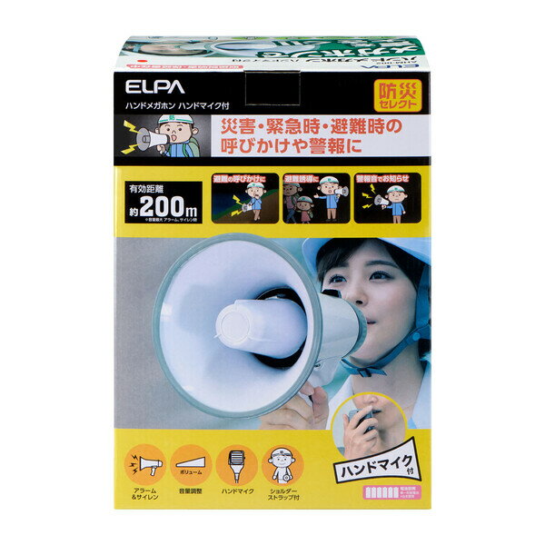 【返品種別A】□「返品種別」について詳しくはこちら□※電池の性能、使用条件により連続使用時間は短くなる場合があります。※周囲、使用の状況により有効距離は短くなることがあります。「担当者のコメント」★マイク付ハンドメガホン【AHM-002】電源は単一形アルカリ乾電池×6本(別売)のハイパワー! 連続使用時で約23時間(音量最大アラーム時)音量はアルカリ電池使用時で105dB/m(音量最大アラーム・サイレン時)防水ではございませんので使用環境にはご注意ください◆人が集まるイベントやお仕事に! 災害時にも役立つ! ◆音声や警報音の音量はレバーで簡単に調整◆ショルダーストラップ付きで肩にぶらさげて持ち運びに便利◆2種類(アラーム・サイレン)の警報音で周囲へ知らせる! ■ 仕 様 ■使用電池:単一形アルカリ乾電池×6本(別売)連続使用時間(アルカリ乾電池使用時)(約): [音量最大アラーム時]23時間 [音量最大サイレン時]13時間出力:最大20W有効距離(約):200m(音量最大アラーム・サイレン時)(アルカリ乾電池使用時)音量:105dB/m(音量最大アラーム・サイレン時)(アルカリ乾電池使用時)マイクロホン:コンデンサーマイクロホンサイズ(約):幅325×奥行195×高さ225mm(最大値)質量(約):680g(ショルダーストラップ含む、ハンドマイク・電池除く)付属品:ショルダーストラップ、ハンドマイク[AHM002ELPA]ELPA生活家電>防災機器>拡声器