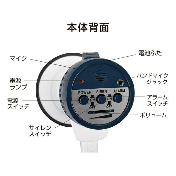 特 徴●イベントやレジャー、アウトドア、防災に活躍するハンディメガホン●乾電池式なので、施設アナウンスが使えない停電時でも使用可能●操作しやすいよう、背面にスイッチを集約した設計●持ち運びや保管に便利な折りたたみ式グリップ●警報サイレン機能、アラーム機能、ボリューム調整機能付き●携帯に便利なショルダーベルト付き仕 様■出力:最大25W■電源:単1形乾電池6本(別売)■マイクロホン:コンデンサーマイクロホン■有効距離:約200m(周囲の状況により異なります)■連続使用時間:約12時間 ※アルカリ乾電池使用時(使用状況により異なります)■本体寸法:(約)幅198×高さ265×奥行325mm(折りたたみ時:(約)幅198×高さ198×奥行325mm)■本体質量:約790g(乾電池除く)■付属品:ハンドマイク、保証書付取扱説明書