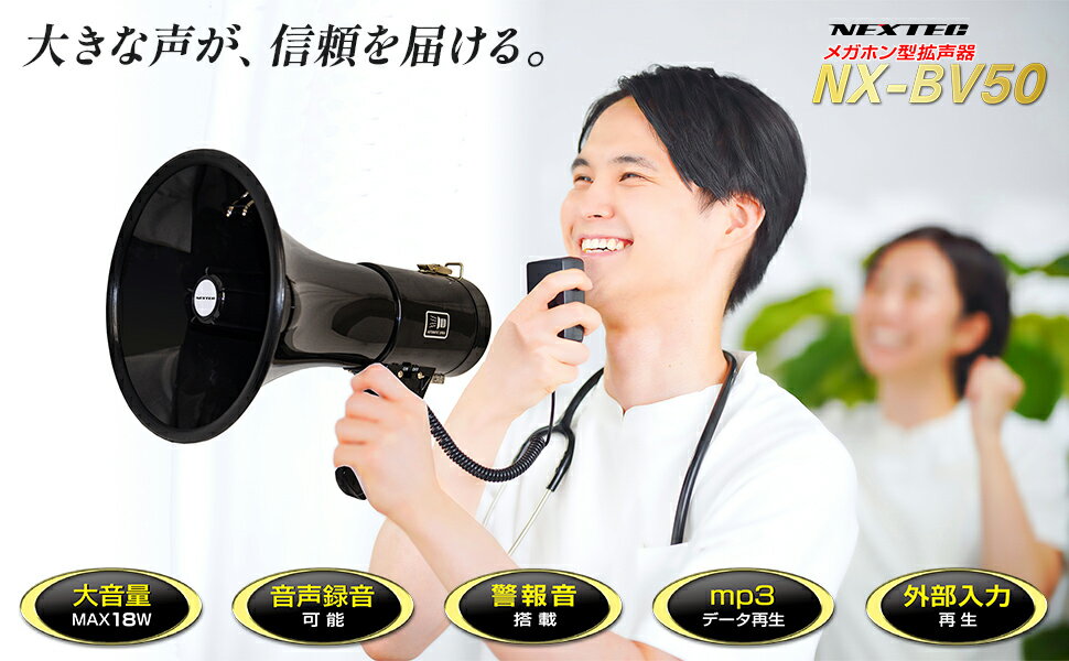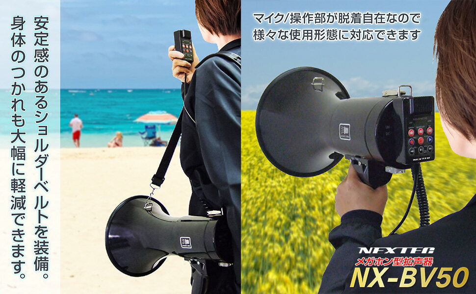 商品名 : F.R.C. NEXTEC メガホン型拡声器 NX-BV50 肩がけ可能なパワフルモデル 各種イベントや避難誘導等に!