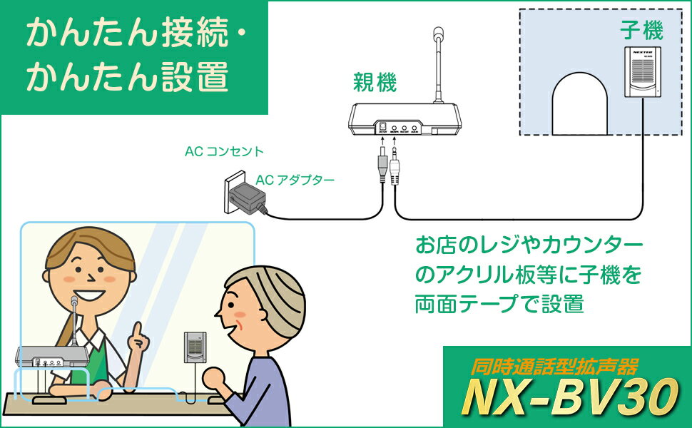 レジや窓口等で、お手軽に設置できる双方向同時通話型拡声器がお役に立ちます。 この商品は有線式の通話装置で、壁やアクリル板などで仕切られたお客様と通話する用途に最適です。 お店や病院、公共施設、映画館やガソリンスタンドなど・・・ 大声を出さずとも多くのお客様へご案内をすることが可能です。 ●音声到達距離に余裕のあるMAX:3Wの大音量。 ●設置かんたん・ボタン操作なしで同時通話! ●PCMレコーダー等の録音機を接続すれば音声を録音可能。 ●ハウリングキャンセル機能付き。 ●ラジカセ、CD等の外部機器(モノラル)からの音声入力に対応しています。 ●親機と子機のスピーカーをON/OFFできるスピーカーミュート機能付。 定格 電源 DC12V/1A 出力 定格2W、最大3W 周波数特性 100Hz 〜 12kHz 親機マイク感度 -42dB 子機マイク感度 -42dB 消費電流 290mA(最大) ACアダプター 入力:AC100V〜240V 50/60Hz 0.5A(最大) 出力:DC12V/1A サイズ 親機:約180(W) × 51(H) × 130(D)mm *突起部含まず 子機:約61(W) × 85(H) × 24(D)mm *突起部含まず 質量 親機:約 388g|子機:約 84g