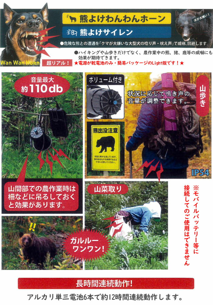熊よけホーン カラビナ 電池ボックス付き Light DCC011HOW-CMD 熊鈴ホーン 熊対策 犬の鳴き声【数量限定】熊よけホーン カラビナ 電池ボックス付き Light DCC011HOW-CMD 熊鈴ホーン 熊対策 犬の鳴き声【数量限定】■熊が大嫌いな大型犬の唸り声・吠え声で危険な熊との遭遇を威嚇して回避!■●アルカリ単三電池6本で約12時間連続動作します。●ハイキングや山歩きだけでなく、農作業中の熊、猪、鹿等の威嚇にも効果が期待できます。●カラビナ付きで柵や腰に吊るしてご使用いただけます。※モバイルバッテリー等に接続してのご使用はできません。【仕様】●重量:約280g(カラビナ・ケーブル含む)●音量:約110db●セット内容:ホーン本体、カラビナ、乾電池ケース●タイプ:わんわんタイプ※本製品には乾電池は付属しません。お手持ちの乾電池をご使用ください。※最大音量の約110dbは非常に大きな音です。一般的には聴覚機能に異常をきたすレベルの音になりますので、音量の設定にはご注意ください。注文について注意事項複数ご注文時は数量により納期が変動する場合がございますので、正確な納期はご注文の確認メールにてご案内させていただきます。