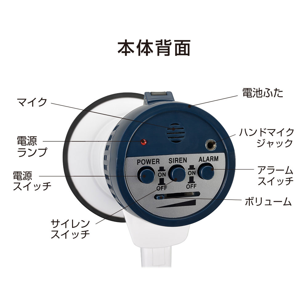 ハンドマイク付きハンディメガホン XB-11SF-B イベントやレジャー、アウトドア、防災に活躍するハンディメガホン 乾電池式なので、施設アナウンスが使えない停電時でも使用可能 操作しやすいよう、背面にスイッチを集約した設計 持ち運びや保管に便利な折りたたみ式グリップ 警報サイレン機能、アラーム機能、ボリューム調整機能付き 携帯に便利なショルダーベルト付き XB-11SF-B (06-5416)仕様 出力 最大25W 電源 単1形乾電池6本(別売) マイクロホン コンデンサーマイクロホン 有効距離 約200m(周囲の状況により異なります) 連続使用時間 約12時間 ※アルカリ乾電池使用時(使用状況により異なります) 本体寸法 (約)幅198×高さ265×奥行325mm(折りたたみ時:(約)幅198×高さ198×奥行325mm) 本体質量 約790g(乾電池除く) 付属品 ハンドマイク、保証書付取扱説明書 ※外観及び仕様は予告なく変更することがあります。