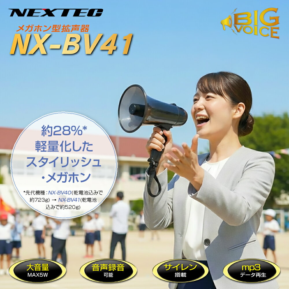 店頭や駐車場、イベント会場や避難訓練などでのご案内に役立ちます。 大声を出さずとも多くのお客様へご案内をすることが可能です。 ●音声到達距離に余裕のあるMAX:5Wの大音量。 ●スタイリッシなトランスルーセントボディ。 ●小型・軽量でわかりやすい操作感。 ●USBメモリ入力に対応し、音楽や音声のMP3ファイルを再生可能。 ●4分間まで音声の録音が可能。(再度録音すると以前の録音は削除されます) ●サイレン機能搭載。サイレン中も音声の再生は有効。 ●ここが変わりました 単2形アルカリ乾電池4本を使用していた先代機種の [ NX-BV40 ] 。 新しい[ NX-BV41 ] では、どこでも入手しやすい単3形アルカリ乾電池4本での使用へと変更されました。 これによって使用時の総重量が約723gから約520gへ、およそ28%も軽減。 より軽快なご利用が可能になりました。 定格 電源電圧 DC6V 単3形アルカリ乾電池4本(*充電式電池は使用しないでください) 出力 5W(最大) 記録媒体 USBメモリー(FAT32のみ対応)・4〜32GB対応 使用時間 約 20 時間 動作温度範囲 0 〜 +50℃ 商品保証期間 1年間(消耗品除く) 外形寸法 約140(幅) × 140(高さ) × 220(奥行)mm *取っ手・突起部除く 本体質量 約520g (電池込み)