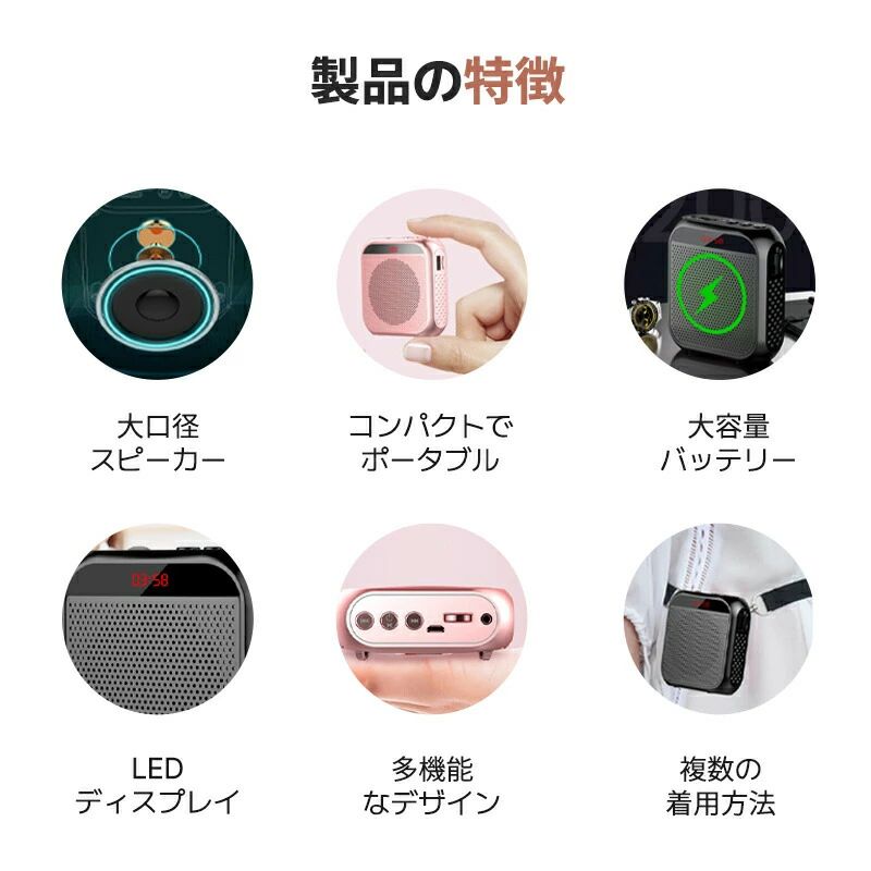 商品仕様最大出力8wカラーピンク、ブラック、ホワイト大きさ9.2cm×8.4cm×2.8cm重さ約120g使用可能時間約20時間充電時間約4時間充電USB充電ケーブル付属品ショルダー、ウエスト兼用調整可能ベルトUSB充電ケーブルヘッドセット型専用マイク用途拡声器として使用できます。スピーカーとしても使用することが出来ます。特徴1.【人間工学設計】付属のヘッドマイクは単一指向性で、フレキシブルアームで自由に動かすことができます。ヘッドマイクは人間工学設計で体に負担がかかりません。すぐ接続して使用できます。さらに、外観は?固な素材ABSであり、高品質の塗り付け塗装を使用して、非常に滑らかで、手触りがもっと絶妙です。2.【手ぶらで使える】専用ベルトを装備し、腰掛け肩掛け肩掛けが可能です。手のひらのような小さくて、重量は約120gぐらいで軽くて、使用中に肩から掛けても腰につけてもいい感じで、とても便利です。注:マイクとスピーカーの間で距離を保持するためにマイクの調整は必要です。3.【 バッテリーが長時間使用可能】尚、内蔵リチウムバッテリー3~5時間の充電で、約20時間ほど使用ができます。バッテリーが長時間使用可能で、使用途中に電源が切れる心配もありません。USB充電ケーブルが付属して、簡単に充電可能です。4.【高音質】8Wのハイパワーを出力でき、音を大きくて明瞭に出せますので、音の大きさと音質にも心配がございません。音を拾う感度良くて、音量は十分に出てクリアーです。5.【豊富な端子搭載】USBメモリとmicro SDが対応でき、直接に差し入れてスピーカーとして音楽を再生できます。外部音声入力(3.5mm AUX 端子)も搭載しており、スマホなどの設備に接続してアウトドアでも美しい音楽を楽しむことができます。(注:マイク入力端子トはAUXポートとして使用可能が、AUXケーブルは付属されません)6.【様々なシーンで大活躍】学校教育の講義と授業ツアガイドツ店舗の販促スピーチプレゼンや社内教育 メーカー希望小売価格はメーカー商品タグに基づいて掲載しています。商品仕様最大出力8wカラーピンク、ブラック、ホワイト大きさ9.2cm×8.4cm×2.8cm重さ約120g使用可能時間約20時間充電時間約4時間充電USB充電ケーブル付属品ショルダー、ウエスト兼用調整可能ベルトUSB充電ケーブルヘッドセット型専用マイク用途拡声器として使用できます。スピーカーとしても使用することが出来ます。特徴1.【人間工学設計】付属のヘッドマイクは単一指向性で、フレキシブルアームで自由に動かすことができます。ヘッドマイクは人間工学設計で体に負担がかかりません。すぐ接続して使用できます。さらに、外観は?固な素材ABSであり、高品質の塗り付け塗装を使用して、非常に滑らかで、手触りがもっと絶妙です。2.【手ぶらで使える】専用ベルトを装備し、腰掛け肩掛け肩掛けが可能です。手のひらのような小さくて、重量は約120gぐらいで軽くて、使用中に肩から掛けても腰につけてもいい感じで、とても便利です。注:マイクとスピーカーの間で距離を保持するためにマイクの調整は必要です。3.【 バッテリーが長時間使用可能】尚、内蔵リチウムバッテリー3~5時間の充電で、約20時間ほど使用ができます。バッテリーが長時間使用可能で、使用途中に電源が切れる心配もありません。USB充電ケーブルが付属して、簡単に充電可能です。4.【高音質】8Wのハイパワーを出力でき、音を大きくて明瞭に出せますので、音の大きさと音質にも心配がございません。音を拾う感度良くて、音量は十分に出てクリアーです。5.【豊富な端子搭載】USBメモリとmicro SDが対応でき、直接に差し入れてスピーカーとして音楽を再生できます。外部音声入力(3.5mm AUX 端子)も搭載しており、スマホなどの設備に接続してアウトドアでも美しい音楽を楽しむことができます。(注:マイク入力端子トはAUXポートとして使用可能が、AUXケーブルは付属されません)6.【様々なシーンで大活躍】学校教育の講義と授業ツアガイドツ店舗の販促スピーチプレゼンや社内教育
