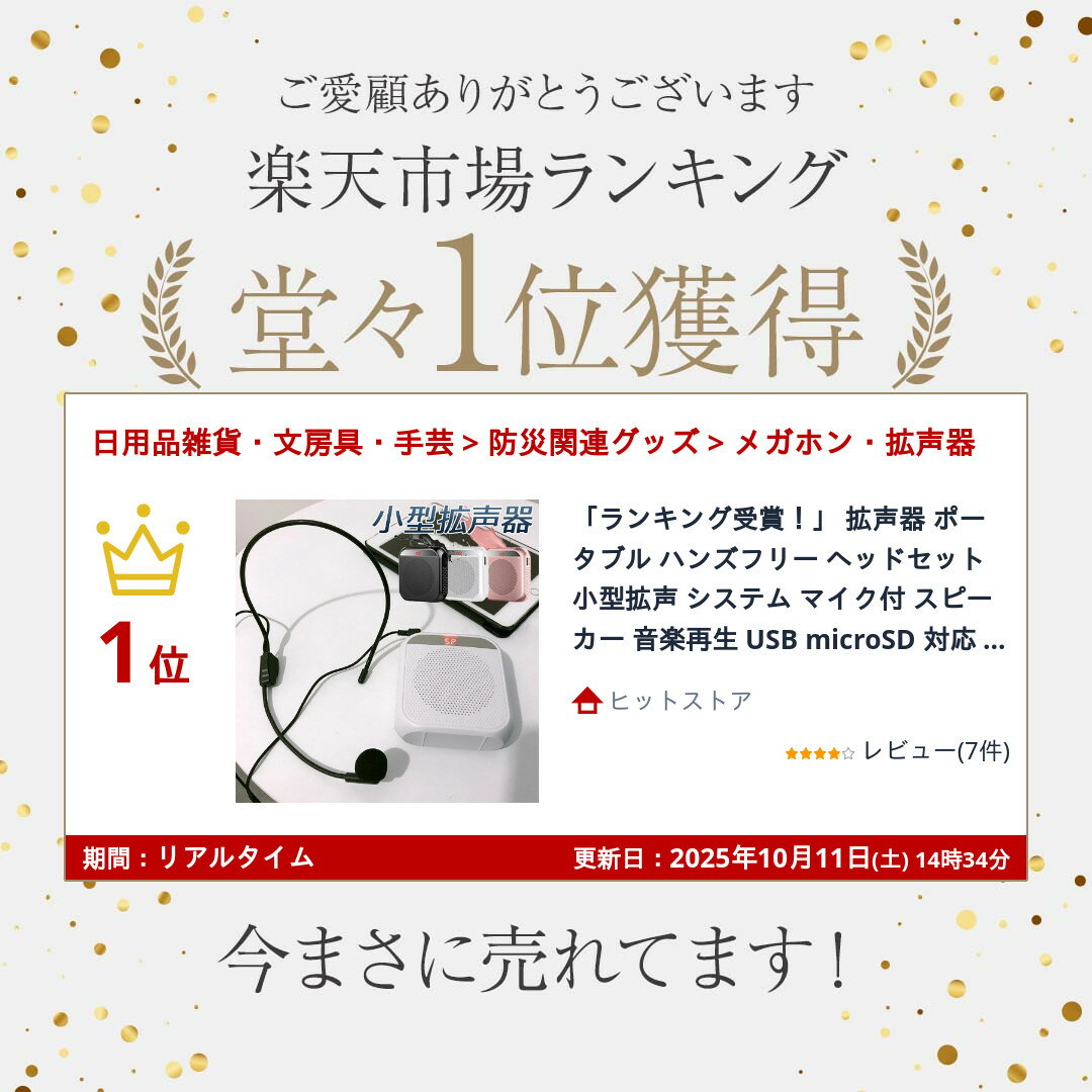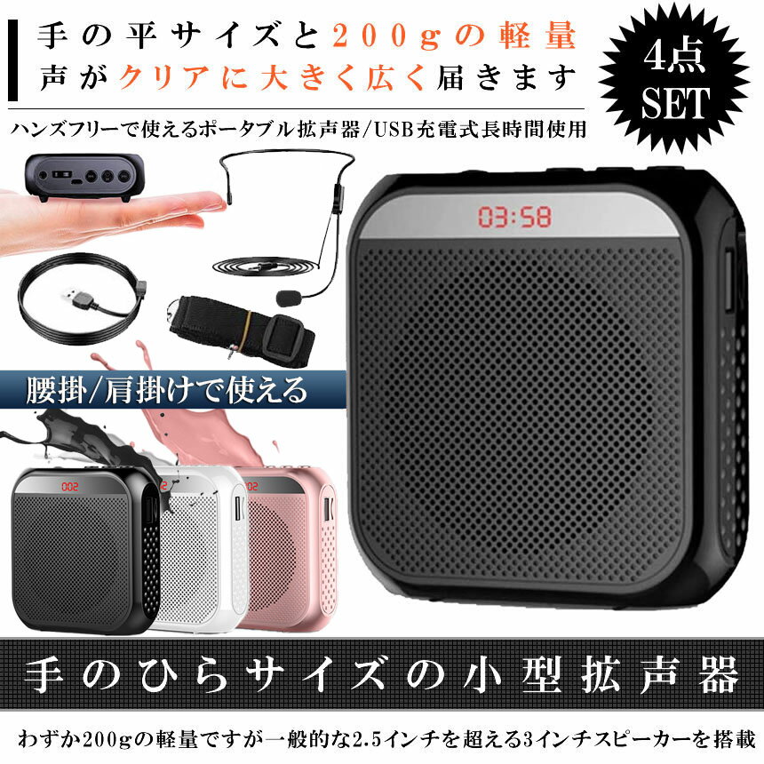 【コンパクト&軽量で大音量】手の平サイズとわずか200gの軽量ですが、一般的な2.5インチを超える3インチスピーカーを搭載しておりますので、声が大きく広く届きます。 また、ノイズ軽減の技術を採用して、発言者の肉声をクリアに拡声できます。【音楽再生可能】USB、マイクロSD、3.5mmジャックを搭載しておりますので、拡声器として使えるほか、USBメモリーやmicroSDカードを挿入したり、スマートフォン?iPhone?PCの3.5mmステレオジャックに接続したり、MP3オーディオファイルの音楽を再生することができます。【用途が様々】ハンズフリーなので、手が自由に動きながら拡声できます。 店頭販売や学校行事、観光ガイドや屋外での集会、体育授業やスポーツの練習など、あらゆる場面でお使いいただけます。【手ぶらで使える】両手が使えるハンズフリーなので、商品を持っての説明や動きながらの説明も可能です。また、本体にストラップとクリップが付いているので服装により装着方法を使い分けできるのです。ヘッドマイク付きでマイク部はフレキシブルアームとなっており自由に動かすことができます。【長持ちの充電式】フル充電はただ3時間ですが、最大20時間で連続使用いただけます。バッテリーの容量は2000mAhです。製品詳細材質:ラバースプレー塗装+ABS樹脂サイズ:8.4 * 9.2 * 2.8cm/重量:120gバッテリー容量:2200 mAhポリマーリチウムバッテリー充電時間:3-5時間/使用時間:20時間特徴1.【人間工学設計】付属のヘッドマイクは単一指向性で、フレキシブルアームで自由に動かすことができます。ヘッドマイクは人間工学設計で体に負担がかかりません。すぐ接続して使用できます。さらに、外観は?固な素材ABSであり、高品質の塗り付け塗装を使用して、非常に滑らかで、手触りがもっと絶妙です。2.【手ぶらで使える】専用ベルトを装備し、腰掛け・肩掛け・肩掛けが可能です。手のひらのような小さくて、重量は約120gぐらいで軽くて、 使用中に肩から掛けても腰につけてもいい感じで、とても便利です。注:マイクとスピーカーの間で距離を保持するためにマイクの調整は必要です。3.【 バッテリーが長時間使用可能】内蔵リチウムバッテリー3〜5時間の充電で、約20時間ほど使用ができます。バッテリーが長時間使用可能で、使用途中に電源が切れる心配もありません。USB充電ケーブルが付属して、簡単に充電可能です。4.【高音質】8Wのハイパワーを出力でき、音を大きくて明瞭に出せますので、音の大きさと音質にも心配がございません。音を拾う感度良くて、音量は十分に出てクリアーです。5.【豊富な端子搭載】USBメモリとmicro SDが対応でき、直接に差し入れてスピーカーとして音楽を再生できます。外部音声入力(3.5mm AUX 端子)も搭載しており、スマホなどの設備に接続してアウトドアでも美しい音楽を楽しむことができます。(注:マイク入力端子トはAUXポートとして使用可能が、AUXケーブルは付属されません)6.【様々なシーンで大活躍】学校教育の講義と授業、ツアーガイド、店舗の販促、スピーチ等様々な場所で活躍します。※日本語取扱説明書、撮影用小物類などは付属しておりません。※簡易包装でのお届けとなります。※モニターにより色合いが若干違いが生じる場合がございます。※デザインは入荷時期により若干変化する場合がございます※海外製造品のため、多少の匂い軽微な傷や汚れ、個体差等ある場合がございます。※商品の使用により生じた如何なる損害・被害も弊社では一切の責任を負いかねますので予めご了承ください。※発送方法について:お届け先、個数によって配送情報に記載の配送業者とは異なる場合がございます。日本郵便、または佐川急便(配送方法はご指定頂けません)でお届けいたします。