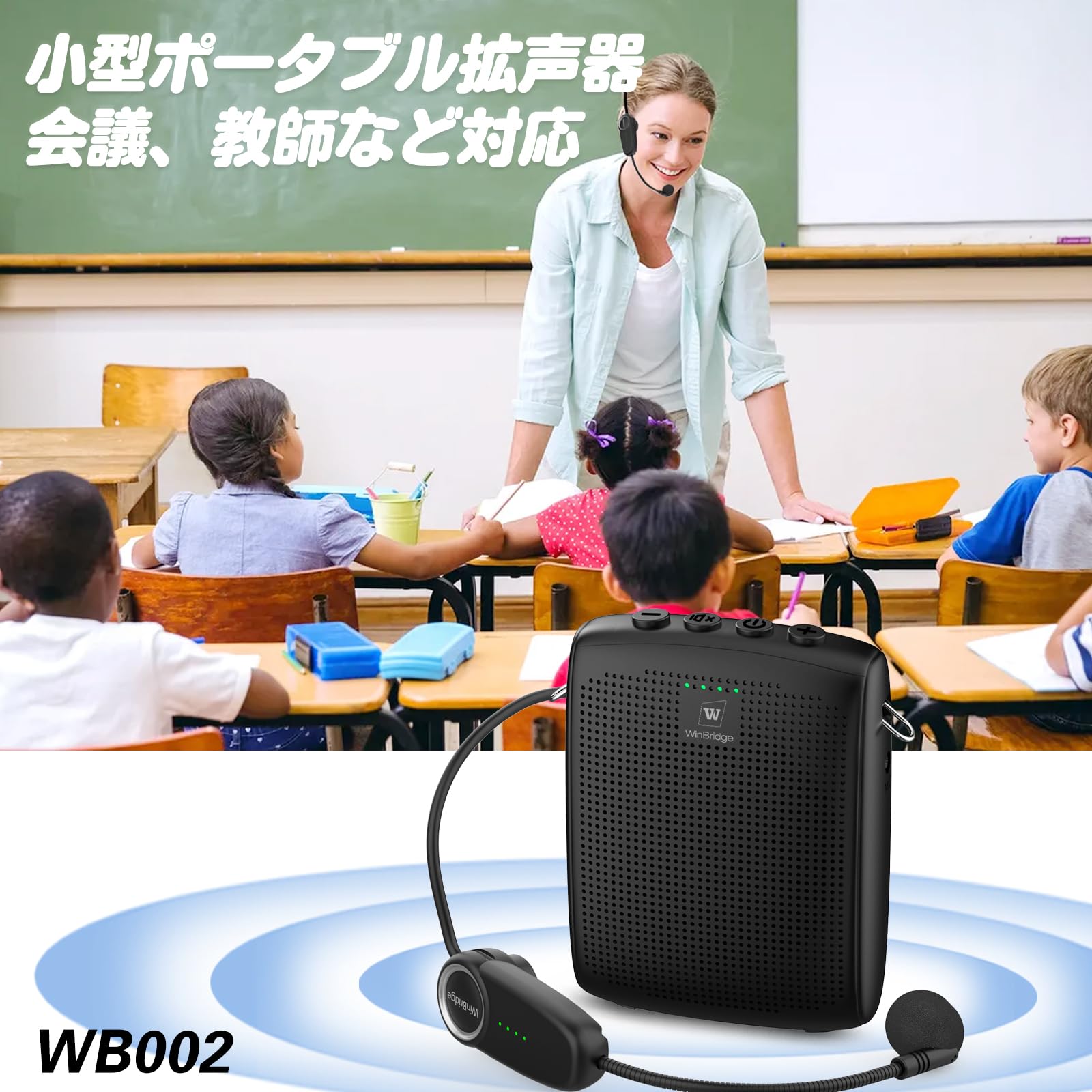 ・教師にお勧め:WB002ポータブル拡声器は、大勢の人や教室の前でスピーチをすることが多い教師にとって実用的な贈り物です。15Wの高出力、約50人教室のような室内では、あなたの声を聞くのに十分な音量があります。教師やヨガ指導者などの方におすすめ。・シンプルなペアリングと操作:小型ハンズフリー拡声器とヘッドセットマイクのペアリングは非常に簡単です。オンにするだけで自動的にペアリングされます。複雑な操作が不要です。ユーザーは必要に応じてワンタッチミュート機能が使えるのが便利です。・電池寿命が長い:携帯型拡声器は2600mAhの充電式電池を内蔵し、1回の充電で最大7~8時間の音声増幅が可能で、ヘッドセットマイクは6時間対応します。・軽くて多用途:winbridgeポータブル拡声器は軽くて、ズボンにつけてもいいです。付属のネックバンドで首にかけ、斜め掛けなど対応。ヘッドセットマイクは軽量で、頭からずり落ちません。取り外し可能でハンドマイクとしても使える。・手頃な価格で信頼性の高い:使いやすいWB002拡声器は、ヘッドセットマイク、ウエストバンド、日本語マニュアルを備えた、手頃な価格で信頼性の高いスピーカーです。WinBridgeは、1年間の保証と30日間の返品ポリシーを提供いたします。