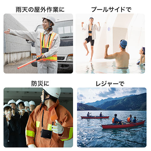 雨天時でも使用可能なIPX4搭載の防水ハンズフリー拡声器スピーカー。小型軽量で身に付けて拡声できるポータブルタイプで、最大16W出力可能な、イベントやツアーガイド、行事などに便利なポータブル拡声器。<特長>●IPX4対応の防水ハンズフリー拡声器スピーカーです。●防水(IPX4)スピーカーと防水(IPX4)ヘッドマイクのセットで急な雨天時やスポーツイベント、災害時などでも使用可能です。※完全防水ではございません。●体にスピーカーとヘッドマイクを装着することができ、両手が自由に使えます。●ポータブルサイズでも十分な音量を出し、聞き取りやすい声質を再現するために3インチの大型スピーカーユニットを採用しています。●最大16Wの音声出力ではっきりと発言内容を伝えます。●電源の確保がしやすい乾電池駆動(単3乾電池4本使用)です。●ヘッドマイク部は防水(IPX4)対応で、フレキシブルアームとなっており自由に動かすことができます。●ヘッドマイクは髪型の乱れを防ぐ細身のネックバンドタイプです。●クリップでベルトなどへの取り付けとストラップ取り付けの2通りが可能で、お好みの使い方ができます。●最後に使用したボリューム設定を記憶し、再度電源ON時にはボリューム設定をすることなくすぐに使用することが可能です。<仕様>【スピーカー部】■サイズ:約W141×D40×H105mm■スピーカー重量:約290g■JIS保護等級:IPX4■実用最大出力:16W■周波数特性:80Hzから12KHz■スピーカー形式:密閉式フルレンジスピーカー(防磁設計・防沫加工)■スピーカーユニットサイズ:3インチ(直径約77.8mm)■ロードインピーダンス:8オーム■マイク入力:3.5mmマイクジャック■電源:単3形乾電池×4本使用■連続使用時間:約15時間程度(中間音量)■材質:ABS 他■付属品:ヘッドマイク×1、ストラップ×1、クリップ×1■生産国:中国■取扱説明書:日本語取扱説明書あり■保証期間:購入日より6ヶ月【マイク部】■JIS保護等級:IPX4■型式:単一指向性エレクレット型■周波数特性:70Hzから16KHz■入力信号:ケーブルマイク(-54dB から -58dB )■動作電圧:1Vから10V■消費電流:0.5mA以下(供給電圧3V)■インピーダンス:1.2Kオーム±30%(1KHz)■ヘッドマイク重量:約21g■ケーブル長:約1m※屋外での使用目安として30人程度、屋内の比較的静かな環境では50人から60人程度への案内が可能です。※本製品はIPX4規格に対応した製品です。【※IPX4:防沫形。あらゆる方向からの飛沫による有害な影響がない製品です。】※スピーカー部のマイクジャックは接続した状態で防水対応となります。※未接続の場合、ジャック部分は防水対応になりませんのでご注意ください。<関連キーワード>400-SP080 サンワサプライ 拡声器,スピーカー,ハンズフリー,防水,IPX4,最大16W,乾電池ラインナップ3WAY給電・最大20Wメモリ再生可・10WBluetooth・12W2人同時使用・10W防水・16W超小型・メモリ再生可・10W高出力・充電式・30W・ワイヤレス、有線マイク
