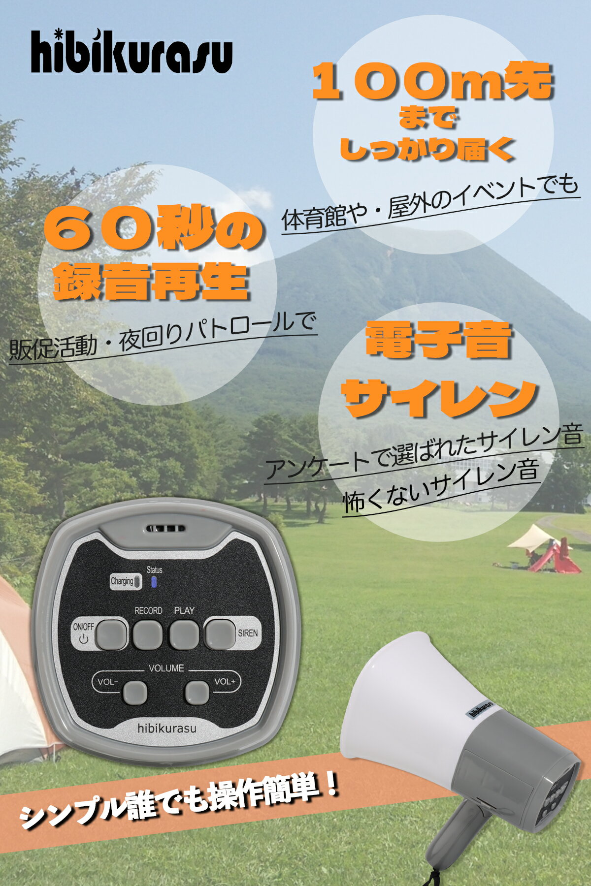 商品名 : hibikurasu 充電式 メガホン 拡声器 録音 再生 機能付き 30W サイレン コンパクト グレー ハンディメガホン ハンドメガホン 録音再生機能 電子音サイレン