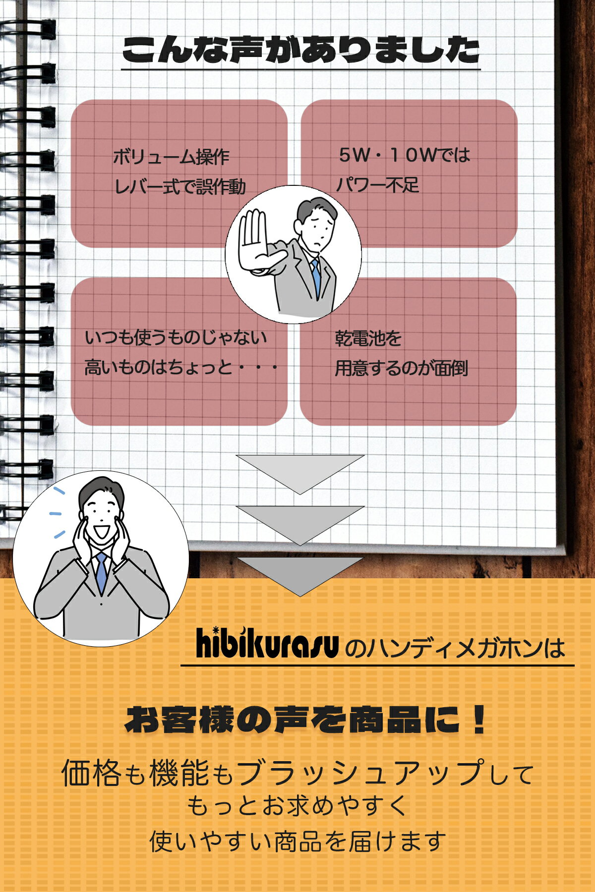 【拡声器】 体育祭・部活・クラブ活動の練習時の声掛けや応援に。 集会・演説会、海や川でのアウトドア、キャンプに。 店頭での呼び込みなど販促活動に。 災害時の防災グッツとして、パワフルな音量で遠くまで声を届けます。 最大音量時には100メートル先まで声が届く、十分なパワーを兼ね備えた30Wメガホンです。 【録音・再生機能】 お気に入りの効果音や音楽を録音し、繰り返し再生することができます。 大声が懸念される場面で「間隔をあけて一列に並んでくださーい!」と事前に吹き込むだけで声を出すことなく誘導することができます。 声が出しにくい環境で、対策できるグッズとして活躍します。 販促アナウンス・店頭プロモーションの繰り返し再生でも大活躍 【電子音サイレン】 避難訓練や設備備品には必須機能。 サイレンがないメガホンはもはや役立たずでは ⁈ 【折りたたみグリップ】 未使用時、保管時には折りたたむことでコンパクトになり邪魔になりません。 折りたためばバッグにもすっぽり入ります。 【ストラップ】 手首に通すことで落下防止になり、長時間持っていても疲れません。 【ABS樹脂製の本体】 ABS樹脂のプラスチック製にすることで、 本体をできる限り軽量に設計しました。 屋外での使用に伴う軽い衝撃であれば耐えることができます。 【シンプルで簡単操作】 誤作動しやすいレバータイプから、子供やお年寄りでも軽い力で押しやすいプッシュボタン式に改良。 シンプルなボタン配置は直感で操作できます。 【乾電池タイプ 】or【 充電タイプ 】 hibikurasuの乾電池タイプ・充電タイプともにパワフルで長時間の使用が可能です。 電気の使えない防災時は充電式より、乾電池。 乾電池交換をするだけで、充電時間が必要ありません。 日常的に使う呼び込みや部活動での使用などは充電タイプがオススメ。 充電できるので面倒でコストのかかる電池交換は不要ですね。 使用するときの重さは、 乾電池タイプは、約620g。 充電タイプは、約420g。 充電タイプは軽いので、長時間の使用や女性でも扱いやすい重量です。 (乾電池タイプ) 乾電池は付属しません。 単2乾電池4本をご用意ください。 (充電タイプ) ACアダプターは付属しません。 (本体)ー(USB TypeA)の充電コードのみ付属します。 スマホの充電で使用しているものでOKです。USB TypeAのACアダプタに挿して充電して下さい。 「毎日使うものでもないし、ちゃんと使えて安いものはないかな〜」 ハンディメガホンは高額なものから安価なものまであって どのレベルのハンディメガホンを買えばいいか正直迷いますよね。 hibikurasuのハンディメガホンは 出来るだけコストを抑えて、便利な機能が盛りだくさん。 いろいろな場面でお使いいただけます。 クラブ活動や応援に コーチが子供達に、仲間の応援に かわいい我が子を応援したい、練習にも本番にも。 仕事で大活躍 広い工場や、屋外の現場など、地声では物足りないシーンで 季節毎の特別な催しごと、展示会・特売会・イベントに。 アウトドアでも大活躍 キャンプや川遊び、山登り、ハイキング、趣味の集まりや、スポーツ大会 屋外・室内問わず大活躍! 防災グッズとして いざという時のために乾電池式で管理しやすい。 充電不要で停電時にも活躍。備えあれば憂いなし! 【Q & A】 ・ 声が小さい時があります。 → 雑音を拾わないようにするため、 マイクの集音距離は短めの設計となっております。 対象の方向にメガホンを向けて、しっかりとマイクに近づけて話してください。 ・ それでも音が小さい時は? → バッテリーが減っている可能性があります。 充電してください。 風が強い時や、雑音環境下では聞こえにくい場合があります。 周辺の環境を配慮し、音量を上げて使用してください。 ・ 防災グッズになりますか? → 定期的に充電し、本体に異常がないか点検をお願いします。 ・ どれくらいの時間使えますか? → 連続使用で約180分です。 ※使用環境・使用方法により変わります。 【 MG1 】 【 MG2 】 【 MG3 】 サイズ 約 径14x長さ22x持ち手10cm 約 径15x長さ25x持ち手10cm 約 径14x長さ21x持ち手10cm 本体重量 約 430 g 約 355 g 約 390 g 電池含む重量 約 620 g 約 390 g 約 420 g 材質 ABS樹脂 PP ABS樹脂 PP ABS樹脂 PP 出力 20W 10W 30W 電源 単2型乾電池1.5V×4本 (別売) 18650型リチウムイオン電池 x1(同梱) 18650型リチウムイオン電池 x2(同梱) 連続使用時間 約150分 約180分 約180分 録音機能 240秒間 60秒間 120秒間 セット内容 本体、説明書 本体、充電コード、説明書 本体、充電コード、説明書 複数の配送会社様を経由し各所で複数回検品を行います。 配送・検品の過程で、稀に外箱が少し潰れる場合があります。◆100メートル先まで声が届く拡声器、屋外でも十分なパワーを発揮する30Wのハンディメガホン ◆【拡声器】の機能に加えて【電子サイレン】と、120秒の【録音・再生機能】 ◆誘導や呼びかけ、販促活動、スポーツの応援など、録音再生機能があれば事前に声を吹き込むことができます。 ◆充電タ