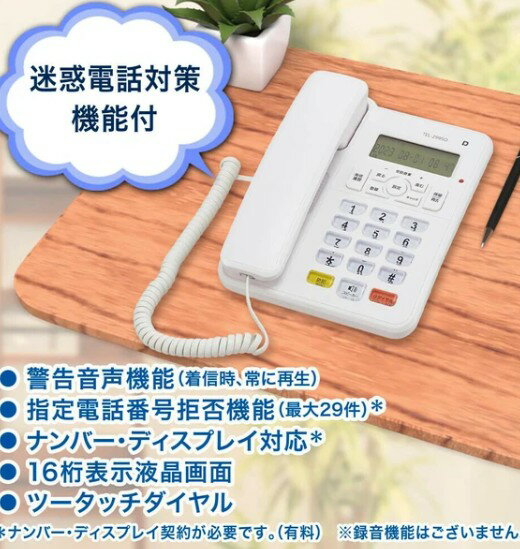 【 特 長 】 ● 着信通話時に警告音声で注意喚起 ● 指定電話番号拒否機能(最大29件) ● ナンバー・ディスプレイ対応 ※ナンバー・ディスプレイ契約が必要です。(有料) ● 16桁表示液晶画面 ● ツータッチダイヤル(電話帳)機能 ● 呼出音量切換スイッチ ● 着信お知らせランプ ● 日付・時刻表示 ● キャッチボタン ※NTTキャッチホン契約が必要です。 ● スピーカーボタン、リダイヤルボタン、保留ボタン、トーンボタン ● 発信履歴、着信履歴 ● 技術基準適合認定品 【 仕 様 】 ■ ダイヤル方式:プッシュ回線/ダイヤル回線(10PPS/20PPS)切替式 ■ 直流抵抗値:295Ω ■ サイズ:(約)幅155×高さ80×奥行195mm (突起物含まず) ■ 質量:約500g ■ 付属品:電話機コード(1.8m)、保証書付取扱説明書 お届けが1週間程度かかる場合があります。北海道・沖縄・離島は別途送料が必要です。在庫更新のタイミングにより、在庫切れの場合はキャンセルさせていただく可能性があります。