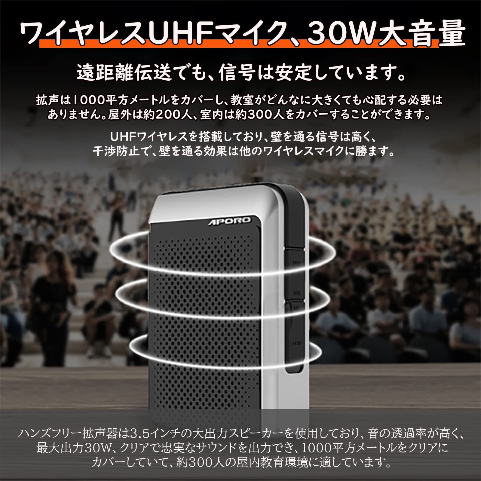 ・・【拡声器 ワイヤレスUHFマイク】HYEIOLポータブルワイヤレス無線マイクは人間工学に基づいた頭に装着されたUHFワイヤレスマイクです。伝送はより信頼性が高く、信号は安定しており、遠距離伝送でも、信号は安定しています。拡声は1000平方メートルをカバーし、教室がどんなに大きくても心配する必要はありません。屋外は約200人、室内は約300人をカバーすることができます。UHFワイヤレスを搭載しており、壁を通る信号は高く、干渉防止で、壁を通る効果は他のワイヤレスマイクに勝ます。・・【Bluetooth対応&音楽再生可能&パソコンスピーカー】Bluetoothに対応しており携帯電話や他のBluetooth機能を備えたデバイスに接続して音楽再生可能で、質の良いBluetoothスピーカーに変身することができます。3.5 mmのオーディオ入力インタフェースでパソコンに接続でき、高品質のパソコンスピーカーでもある。BluetoothまたはUSBメモリを使用して、メモリカードで音楽を再生するときにマイクを使って話したり、歌ったりすることができます。同時に拡声出力できるためカラオケ感覚で使用することも可能です。・・【ノイズキャンセリング&最大30W大音量】ハンズフリー拡声器は3.5インチの大出力スピーカーを使用しており、音の透過率が高く、最大出力30W、クリアで忠実なサウンドを出力でき、1000平方メートルをクリアにカバーしていて、約300人の屋内教育環境に適しています。原音拡音電気音響システムは真実の音を還元し、叫び声がなく、騒音を低減し、高忠実で、音をより感動させる。ノイズキャンセリング機能付き、音質がもっとクリアにになるということを簡単に実現できます、先生の視線が届くところで、音がはっきりに伝わります。・・【幅広い用途】拡声器サポートBluetooth5.0、TF Card (micro sd)カード、USBメモリーディスクおよび3.5mm auxオーディオ入力(micポートはauxポートとして使用可能)。ハンズフリーなので、ニーズの異なる室内でも屋外でも使いたい場所へ気軽に持ち出せます。室内では、教室、講義や講演、会議室、ヨガ室、ダンスルーム、ジム、スーパーで販促して使用することができます。屋外のガイド、コーチ、街頭演説、大学応援団、学校行事、体育授業、屋台でもスピーカーが使えます。 店頭販売や学校行事、観光ガイドや屋外での集会、体育授業やスポーツの練習など、あらゆる場面でお使いいただけます。・・【コンパクト&軽量でハンズフリー】10.1*13.5*3.7 cmのサイズと382 gの重量を搭載しているので、マイクは非常に軽く、手のひらサイズで簡単に収納して持ち運ぶことができます。両手が使わなくても簡単に使用可能素晴らしいハンズフリーのポータブル拡声器なので、商品を持っての説明も、動きながらの説明も可能です。また、腰ベルトとベルトバックルを付属して、腰掛け、斜めがけ、ワンショルダーどちらも使用可能3wayポータブル拡声器です(ワイヤレス版でも机の上に直接置いて使用可能)。・・【使い方】拡声器を使用する前に、UHF マイクを満充電してください。 MODE キーを長押しして 2 秒後に電源を入れます。最初に「HI」とバッテリーアイコンが表示され、2 秒後に「2.4」が点滅する画面(接続待ち状態)に入ります。接続に成功すると「2.4」が点灯し続けます。 Bluetooth ペアリング:MODE キーを押して Bluetooth モードに切り替えます。本体の LED スクリーンに「bLUE」が表示されて点滅します。携帯電話の Bluetooth をオンにし、更新して「APORO T18」という Bluetooth 名を探し、クリックして接続します。ペアリングに成功すると、LED スクリーンの「bLUE」文字が点灯し続けます。・・【アフターサービス】 ご使用中、製品の使用についてご不明な点がございましたら、ご安心ください、注文記録を通じてご連絡ください。 弊社は常に最善を尽くして保証サービスを提供いたします。